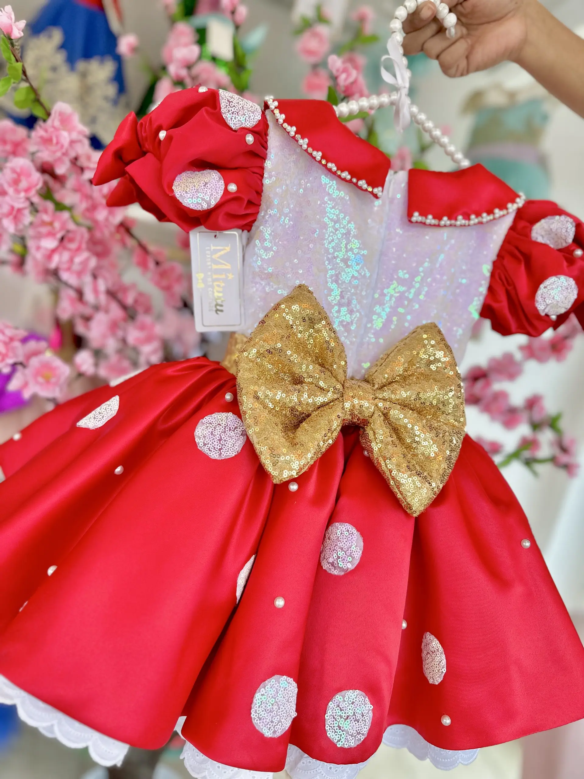 Hermoso vestido de fiesta diseñado en color rojo con lunares blancos, con mangas cortas abullonadas , un hermoso lazo oro a la altura de la cintura que representa el icónico lazo de Minnie, con detalles encantadores bordados a mano, y encaje en la parte inferior del vestido lo que da un toque de feminidad y encanto característico de Minnie Mouse.