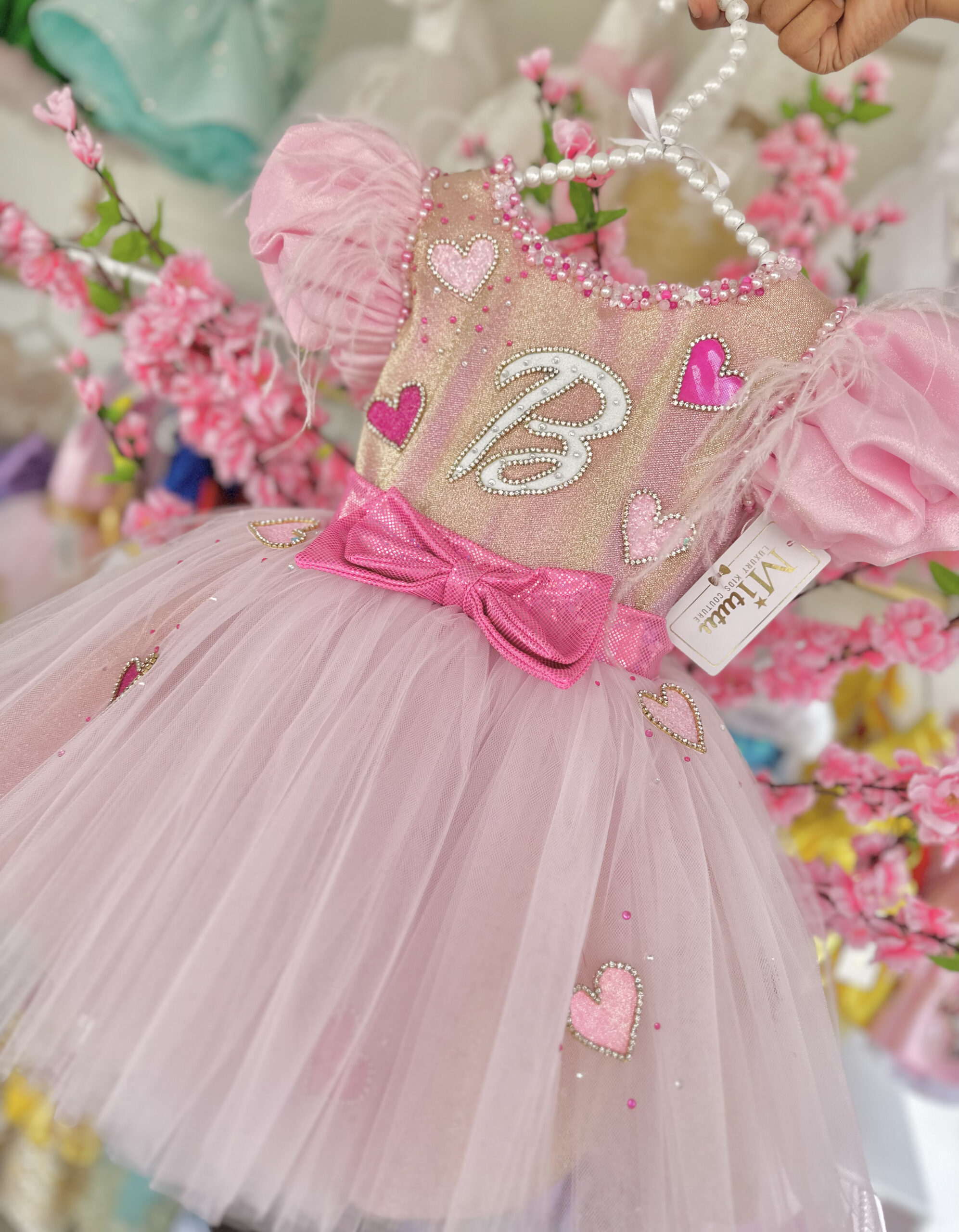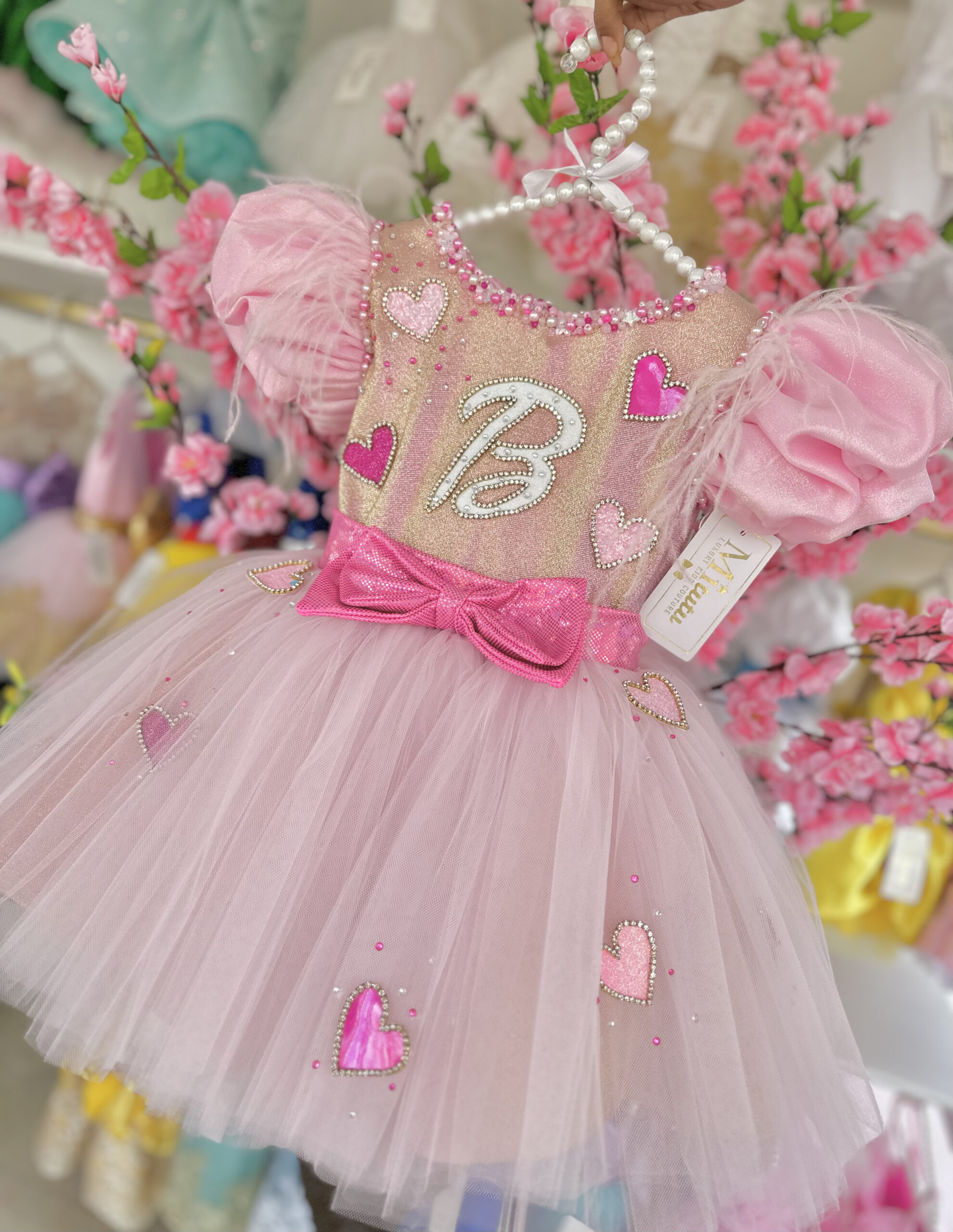 Este adorable vestido Barbie Gold, modelito corto a la rodilla y esponjoso. Cada detalle está confeccionado con amor y destreza, realzando la belleza del vestido con bordados a mano que añaden un toque único y encantador. ¡El vestido perfecto para una fiesta inolvidable!