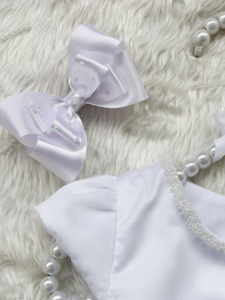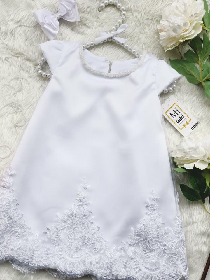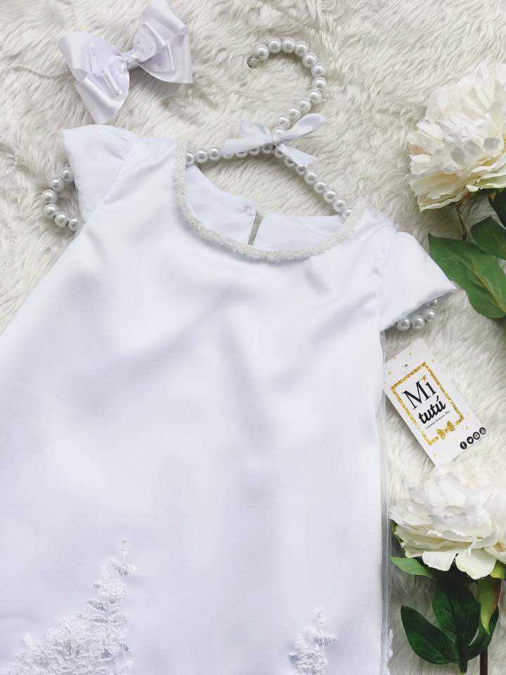 Encantadora batita ideal para Bautizo, ceremonia. Cada detalle de este vestidito está adornado con bordados hechos a mano, elevando la calidad y el encanto. Con un modelo corto a la rodilla. Incluye moñito pasador.