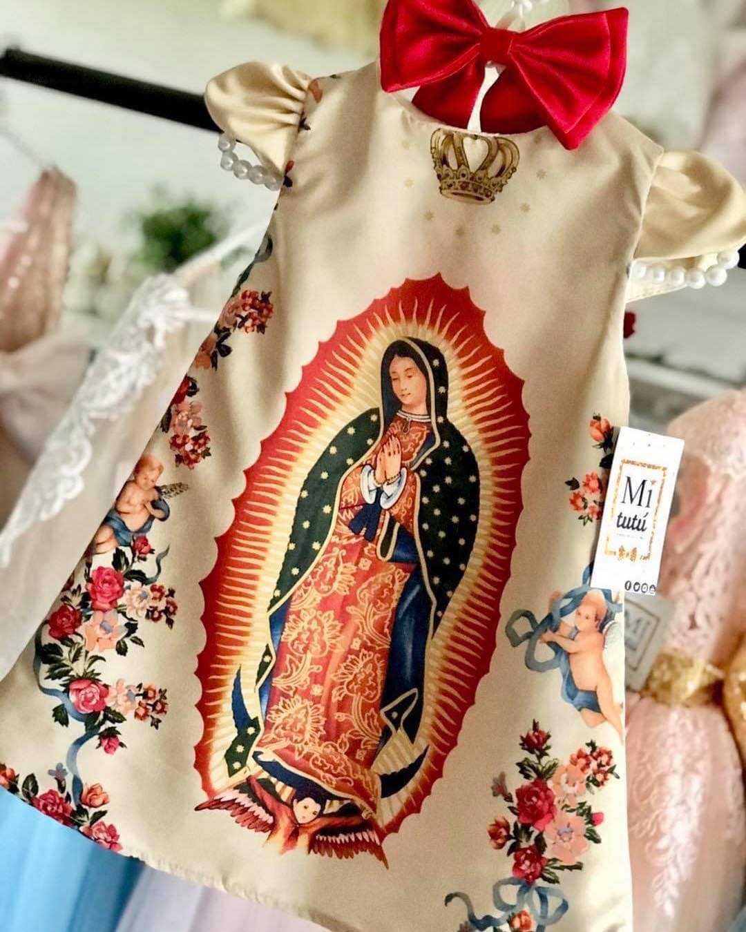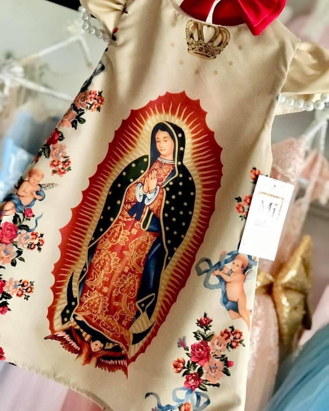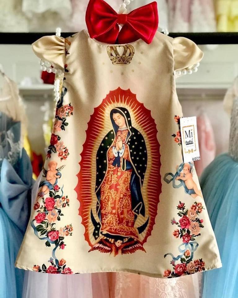 Hermosa batita inspirada en la Virgencita de Guadalupe, muestra la gracia y la devoción con un toque de dulzura. Con un diseño corto a la rodilla, en color beige, este modelo esponjado resalta la inocencia y la alegría de tu pequeña. Detalles cuidadosamente elaborados rinden homenaje a la espiritualidad, mientras que la suavidad y elegancia del vestido aseguran que sea una elección encantadora para cualquier celebración. Un atuendo celestial para que tu niña brille con luz propia en su día especial.