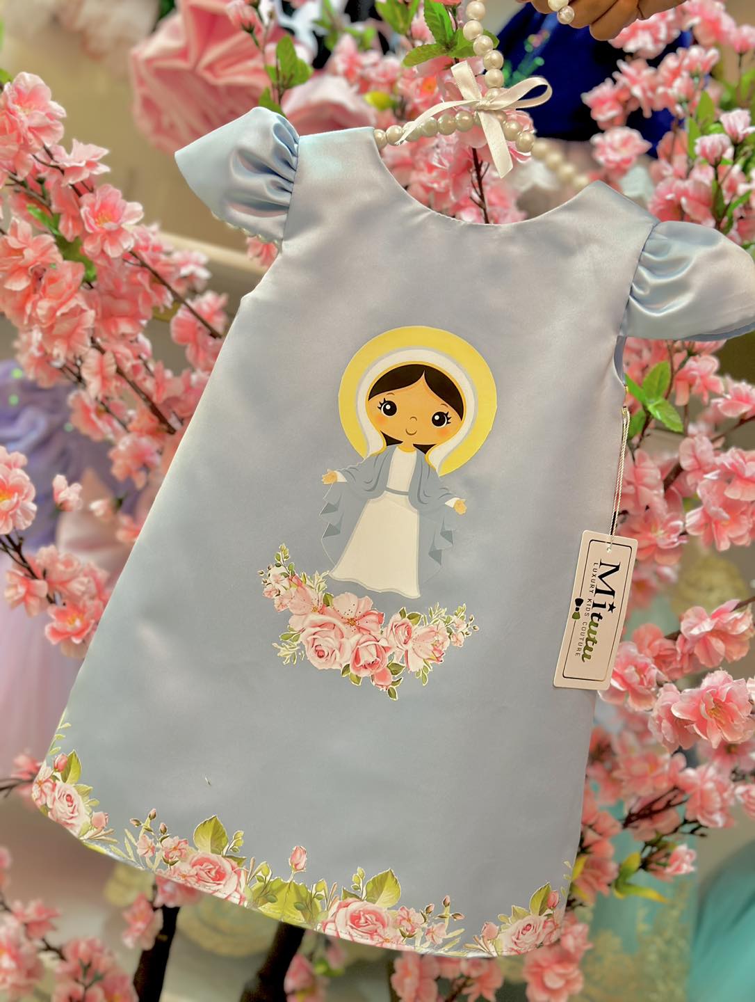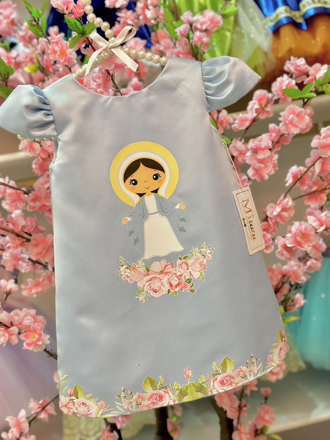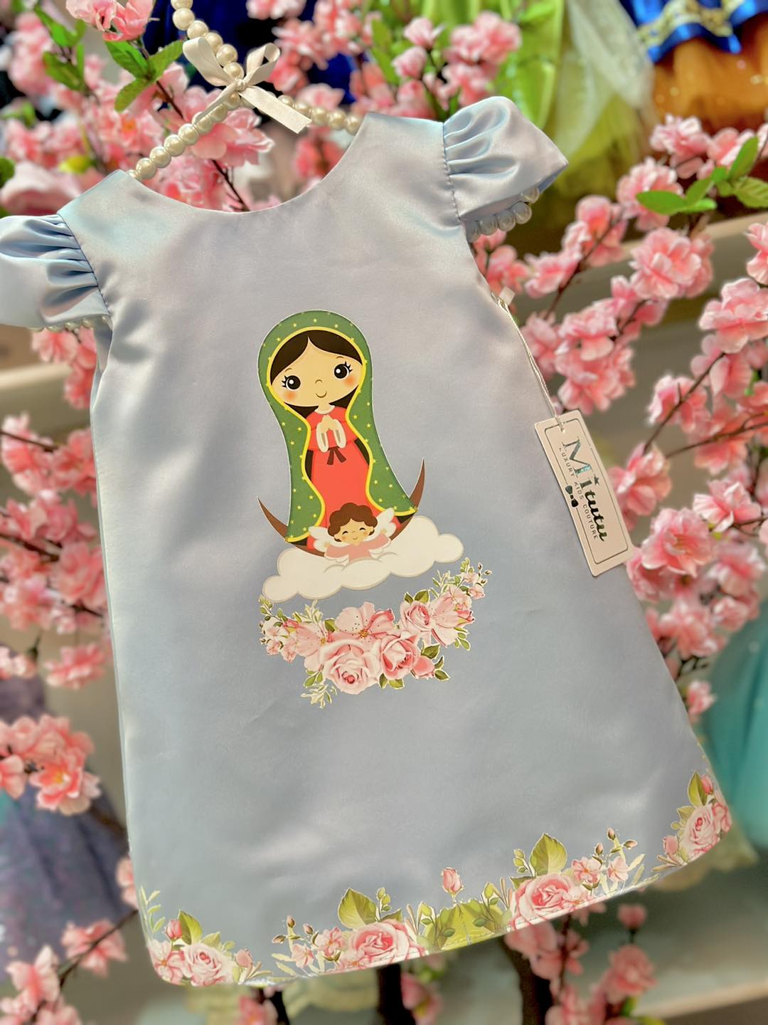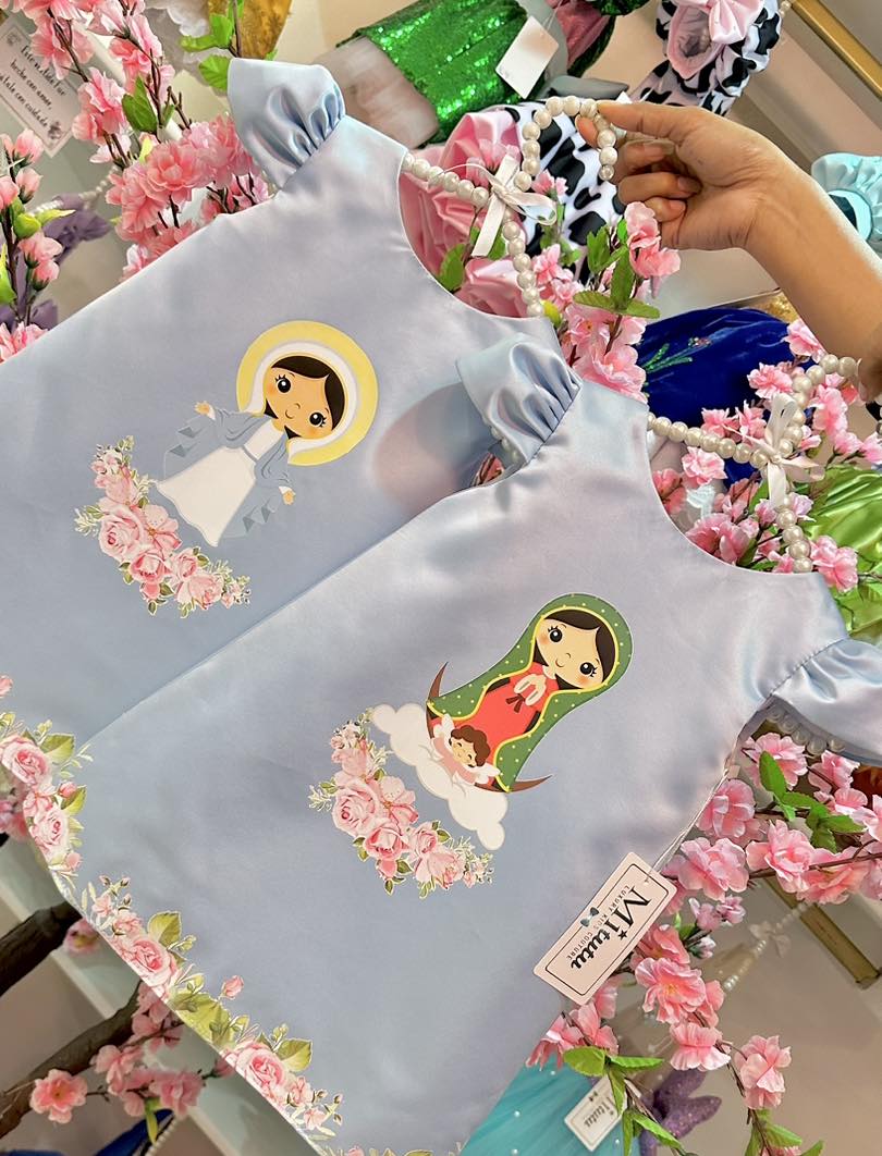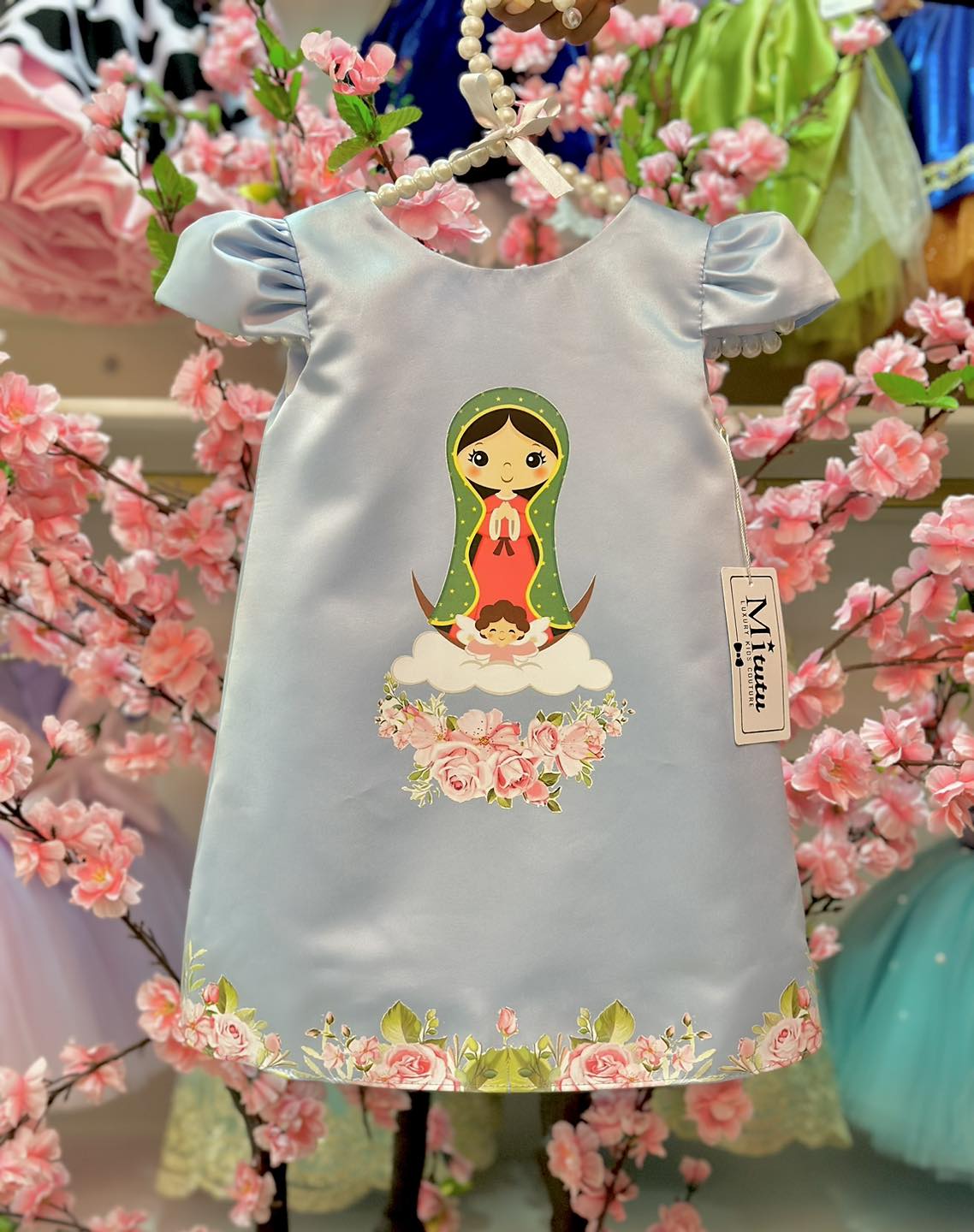 Hermosa batita inspirada en la Virgencita de Guadalupe y Virgen Maria, muestra la gracia y la devoción con un toque de dulzura. Con un diseño corto a la rodilla, este modelo esponjado resalta la inocencia y la alegría de tu pequeña. Detalles cuidadosamente elaborados rinden homenaje a la espiritualidad, mientras que la suavidad y elegancia del vestido aseguran que sea una elección encantadora para cualquier celebración. Un atuendo celestial para que tu niña brille con luz propia en su día especial.