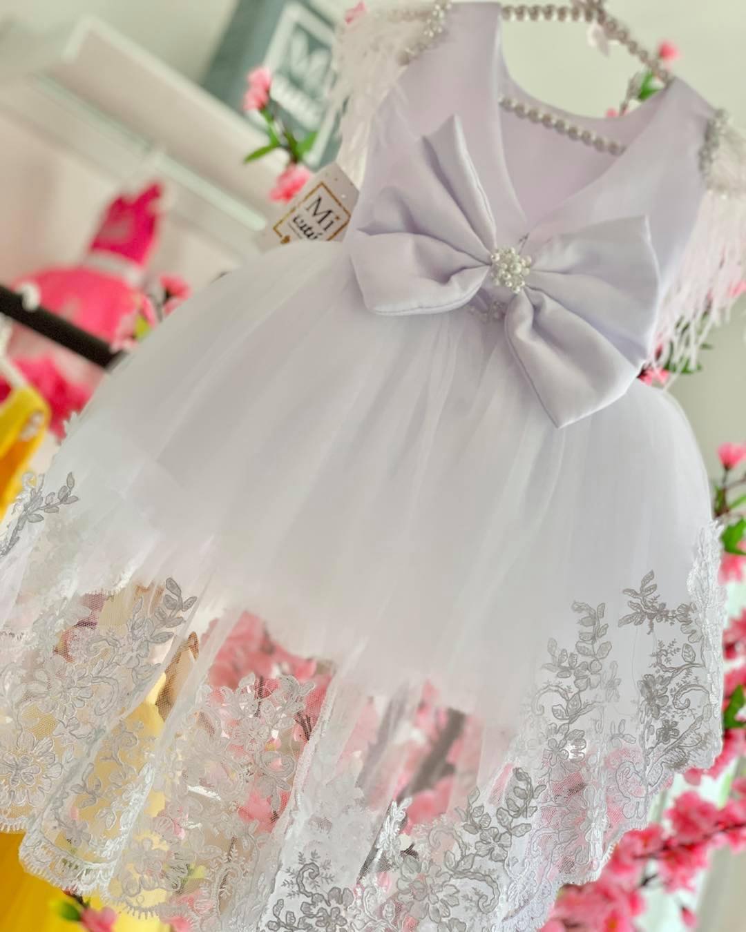 Encantador vestido ideal para Bautizo, ceremonia. Cada detalle de este vestidito está adornado con bordados hechos a mano, elevando la calidad y el encanto. Con un modelo corto a la rodilla con colita y una esponjosidad irresistible.