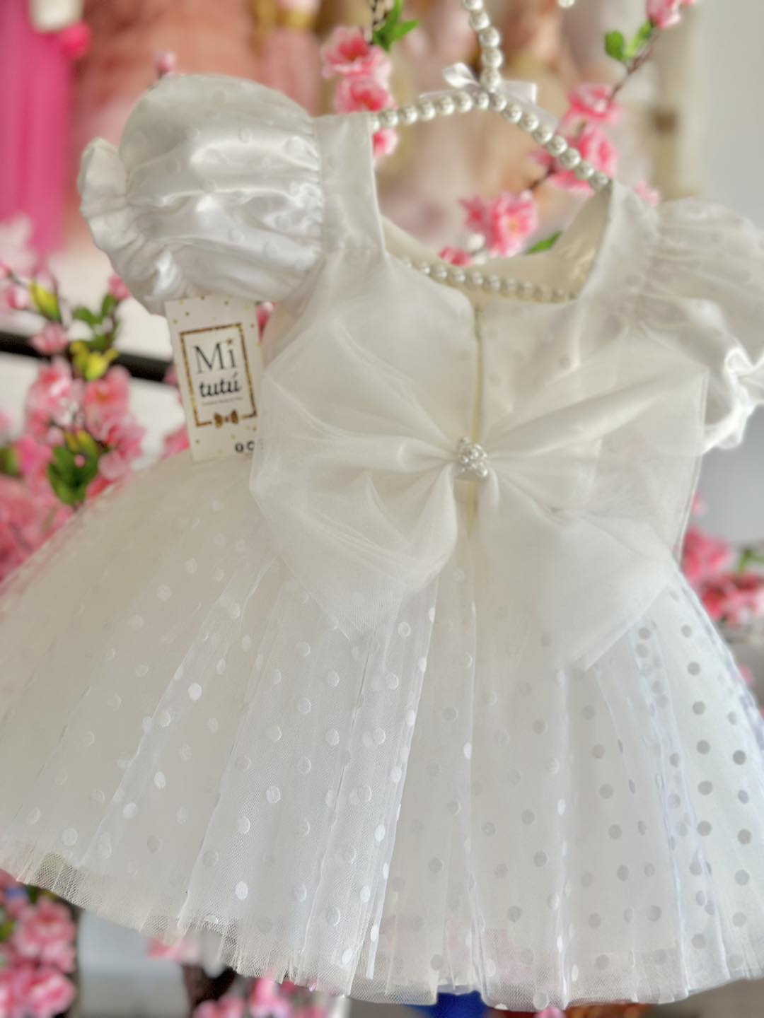 Encantador vestido ideal para Bautizo, ceremonia. Cada detalle de este vestidito está adornado con bordados hechos a mano, elevando la calidad y el encanto. Con un modelo corto a la rodilla y una esponjosidad irresistible.