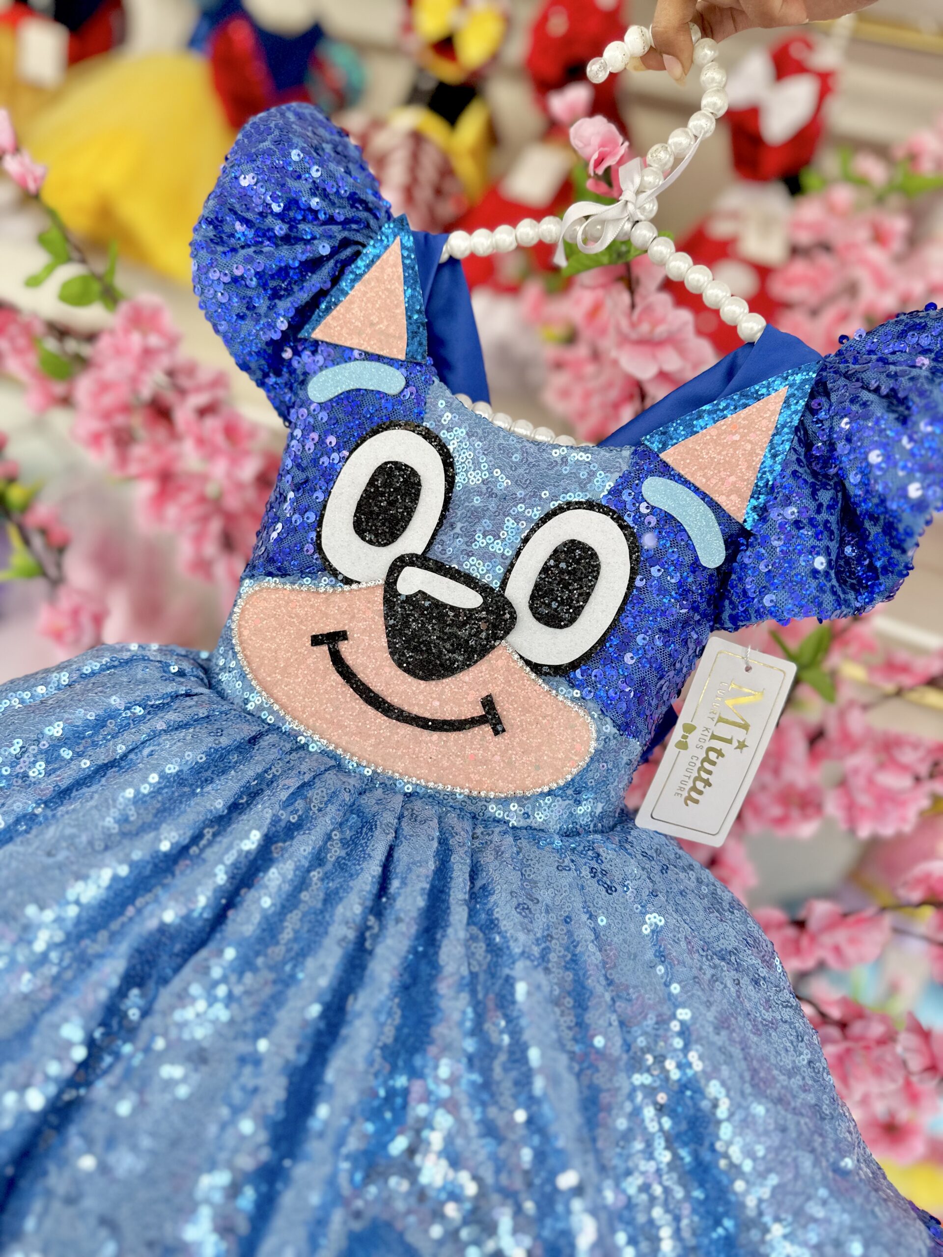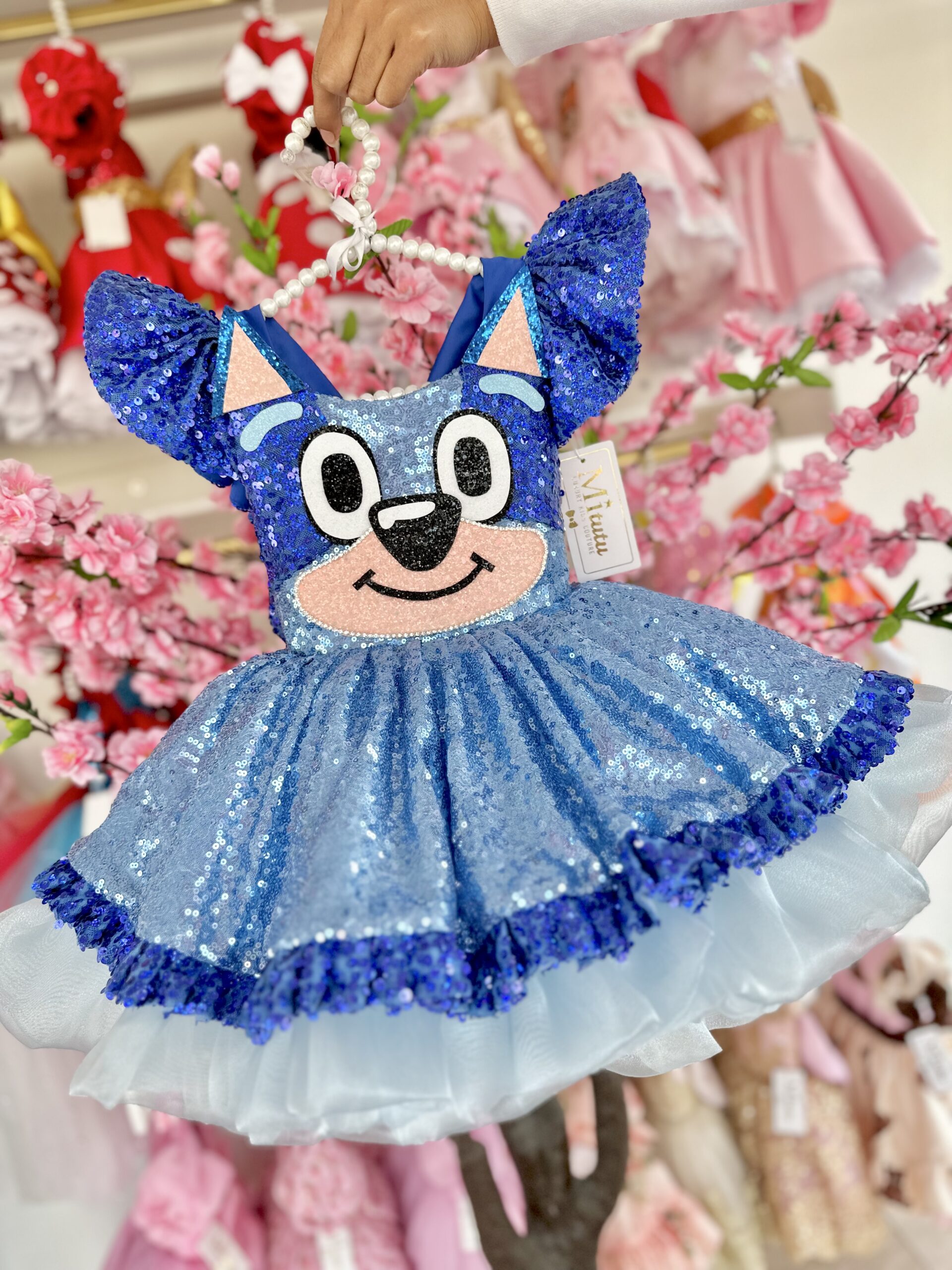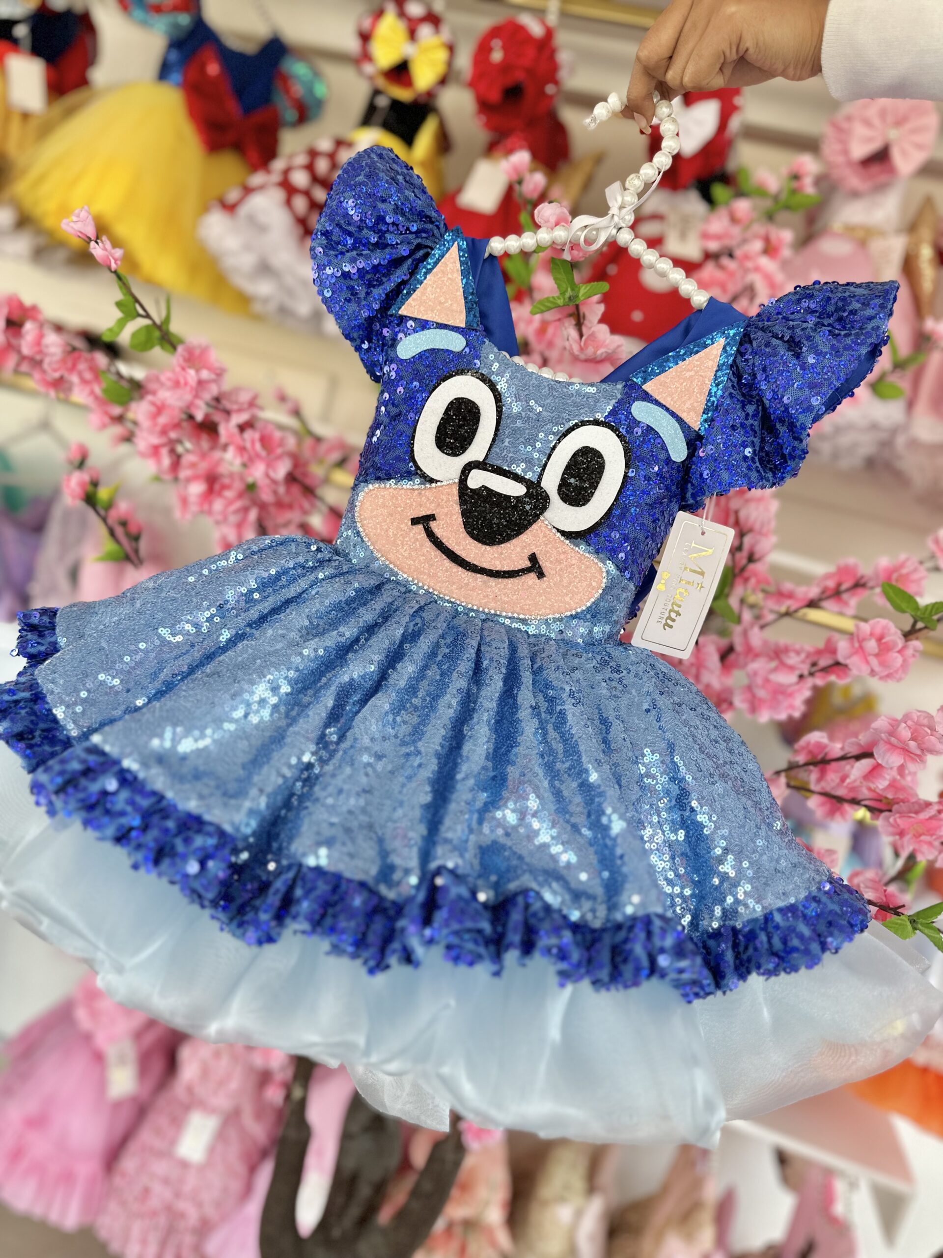 Encantador vestido de Bluey. Este vestidito, confeccionado con esmero y detalles bordados a mano, se adorna con deslumbrantes lentejuelas que resaltan su encanto único. Su modelo corto a la rodilla y muy esponjadito le confiere un toque de frescura y diversión, perfecto para las pequeñas que desean bailar y disfrutar al máximo. ¡Presenciar a tu niña luciendo este vestido es presenciar la alegría hecha moda!