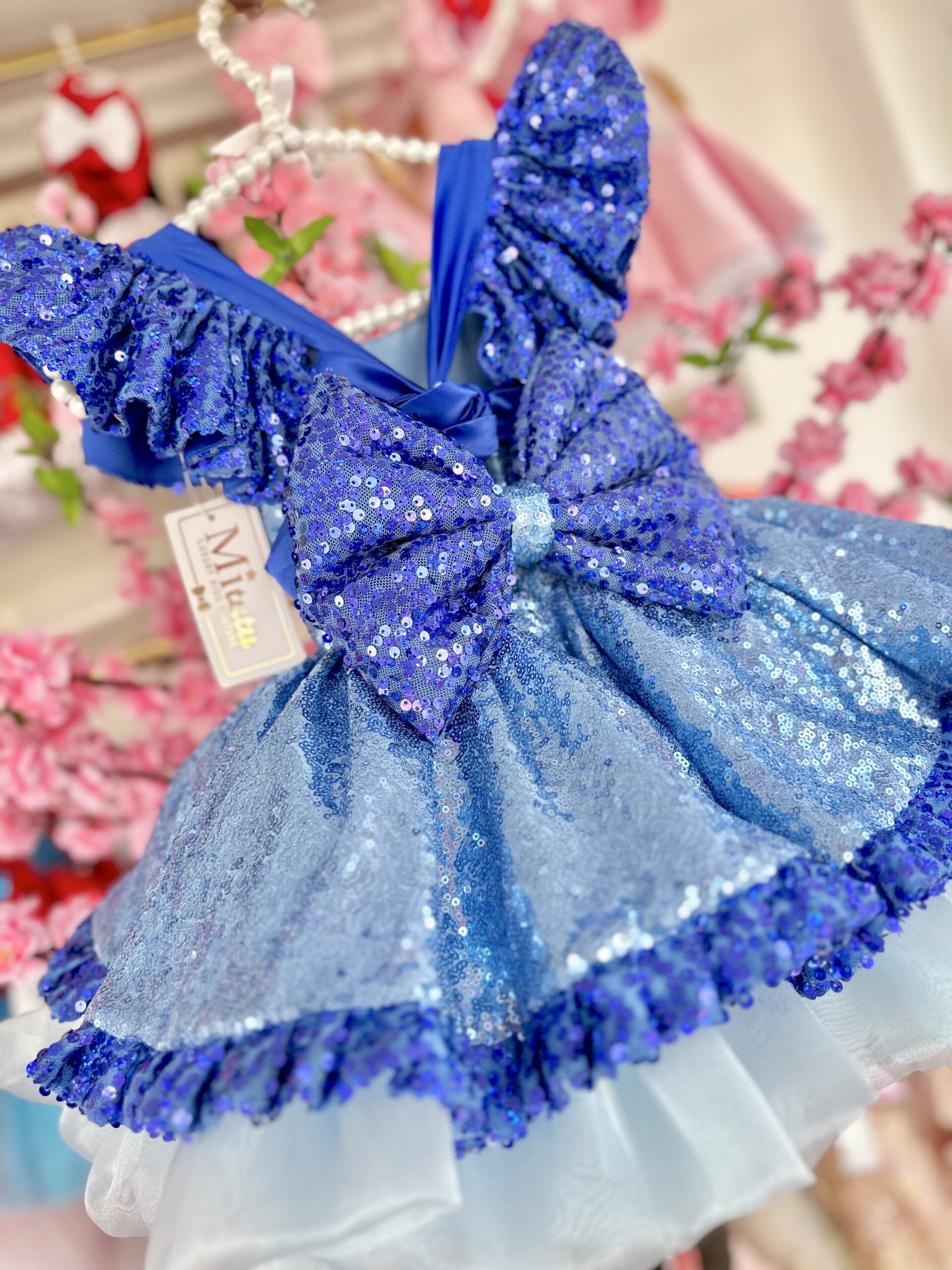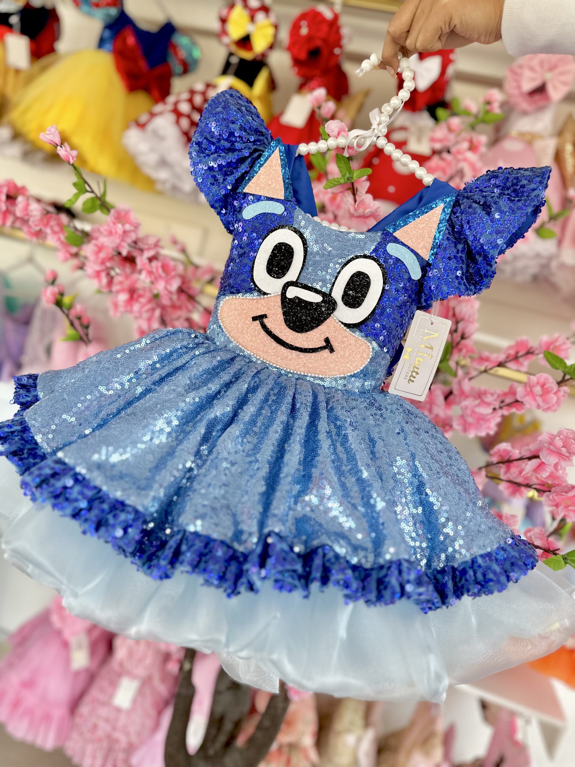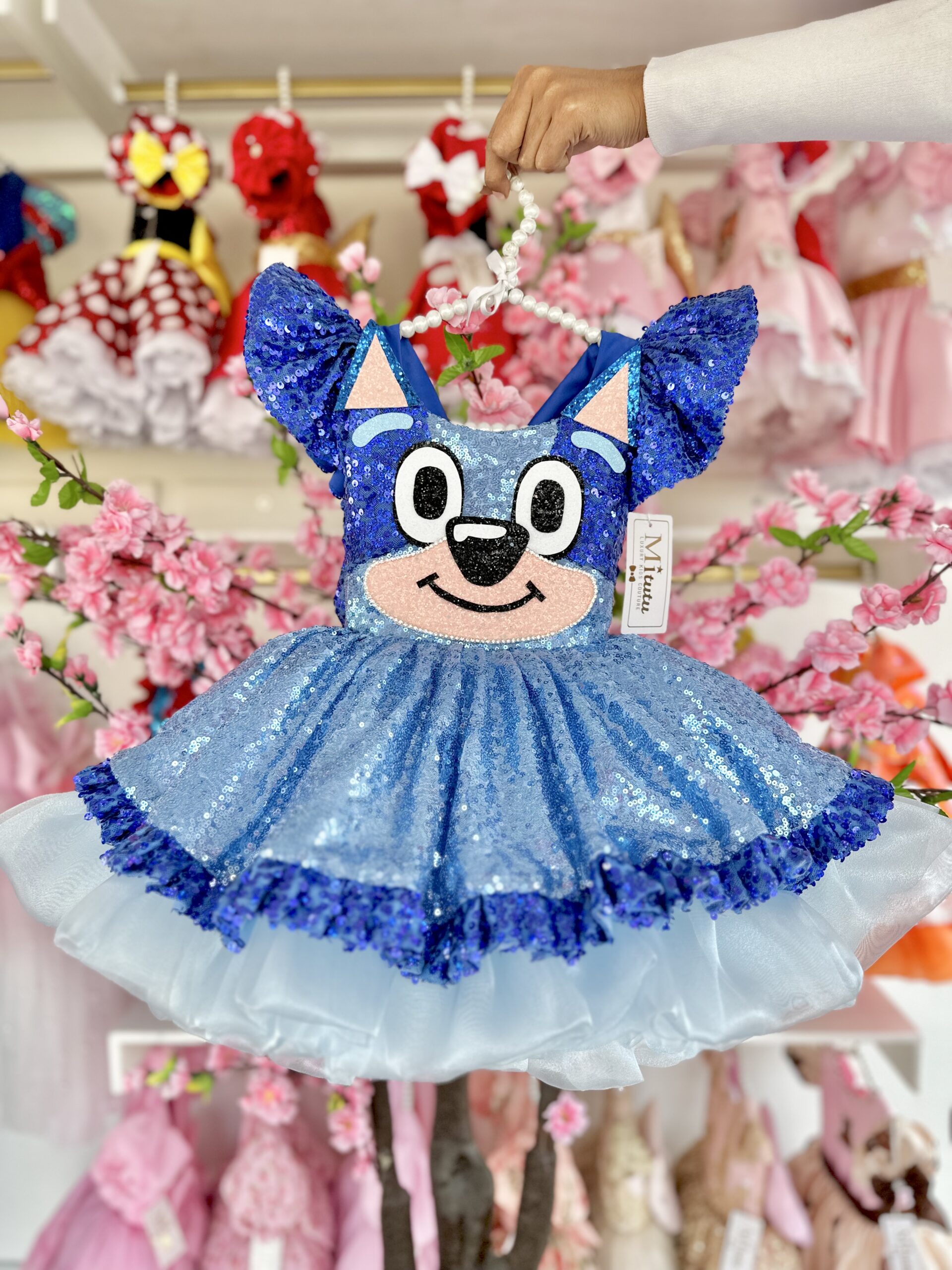 Encantador vestido de Bluey. Este vestidito, confeccionado con esmero y detalles bordados a mano, se adorna con deslumbrantes lentejuelas que resaltan su encanto único. Su modelo corto a la rodilla y muy esponjadito le confiere un toque de frescura y diversión, perfecto para las pequeñas que desean bailar y disfrutar al máximo. ¡Presenciar a tu niña luciendo este vestido es presenciar la alegría hecha moda!