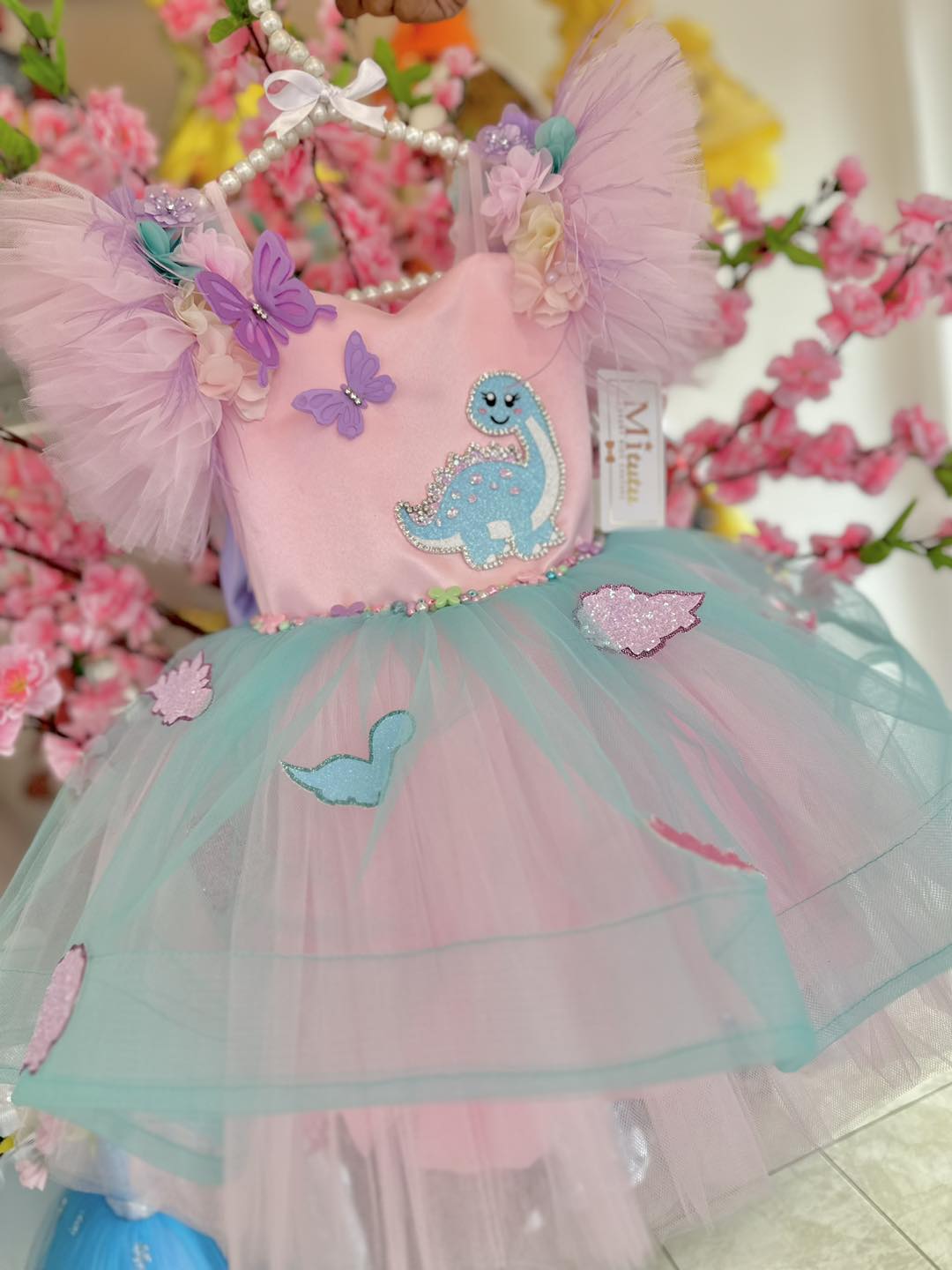 Encantador vestido de Dinosaurios, incluye a sus personajes favoritos confeccionados a mano, añadiendo un toque único y especial.