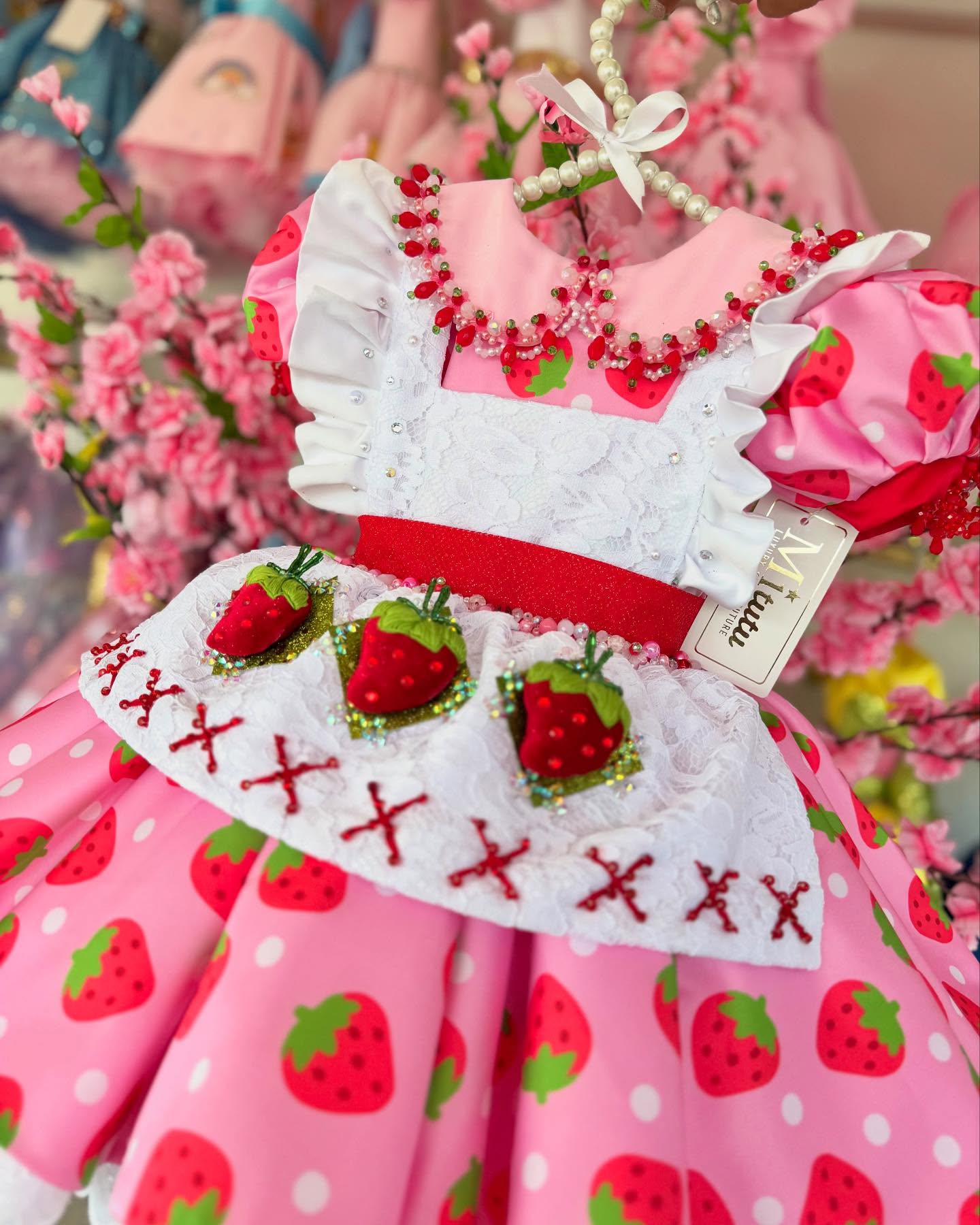 Encantador vestido inspirado en Fresitas 3D. Su modelo corto a la rodilla y muy esponjadito le confiere un toque de frescura y diversión, inspirado en Rosita Fresita, ¡Presenciar a tu niña luciendo este vestido es presenciar la alegría hecha moda!