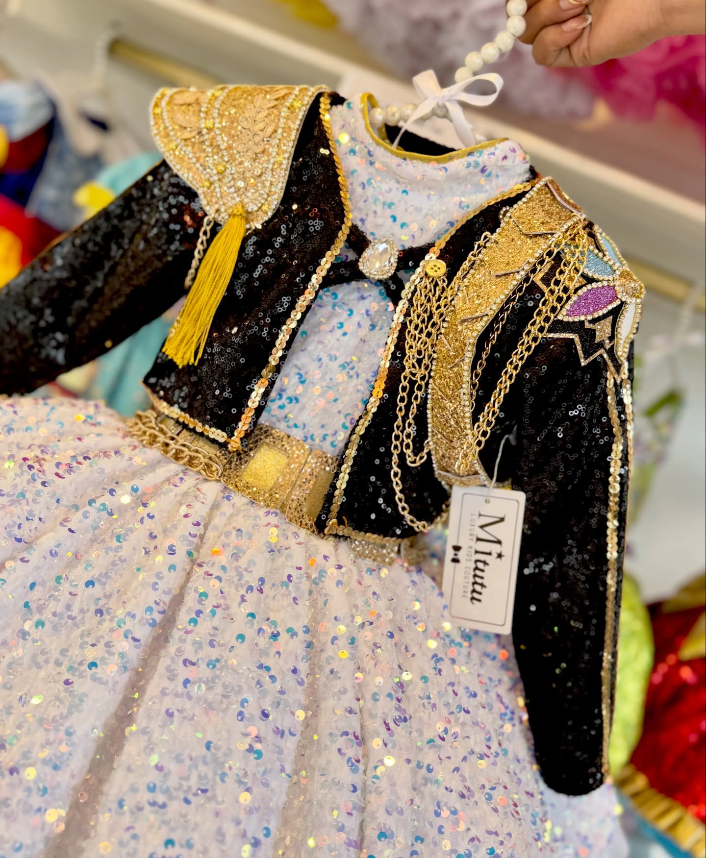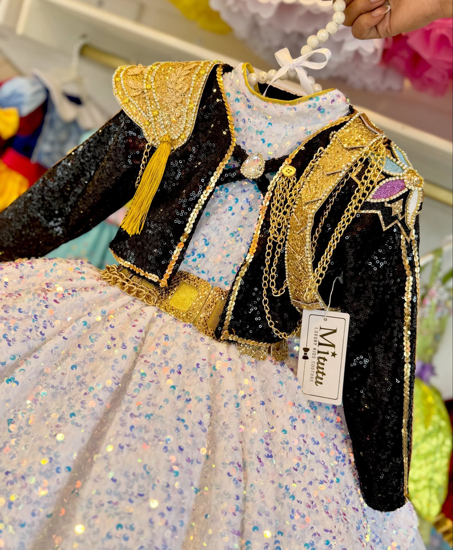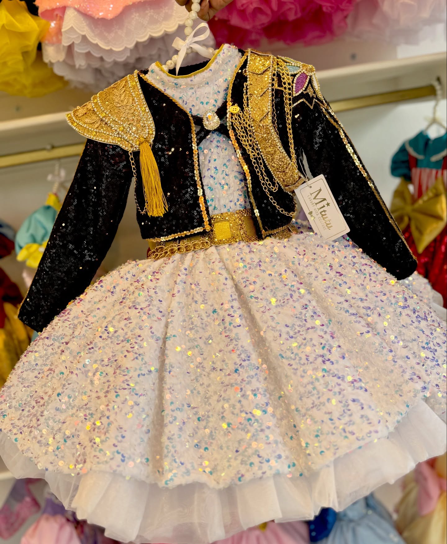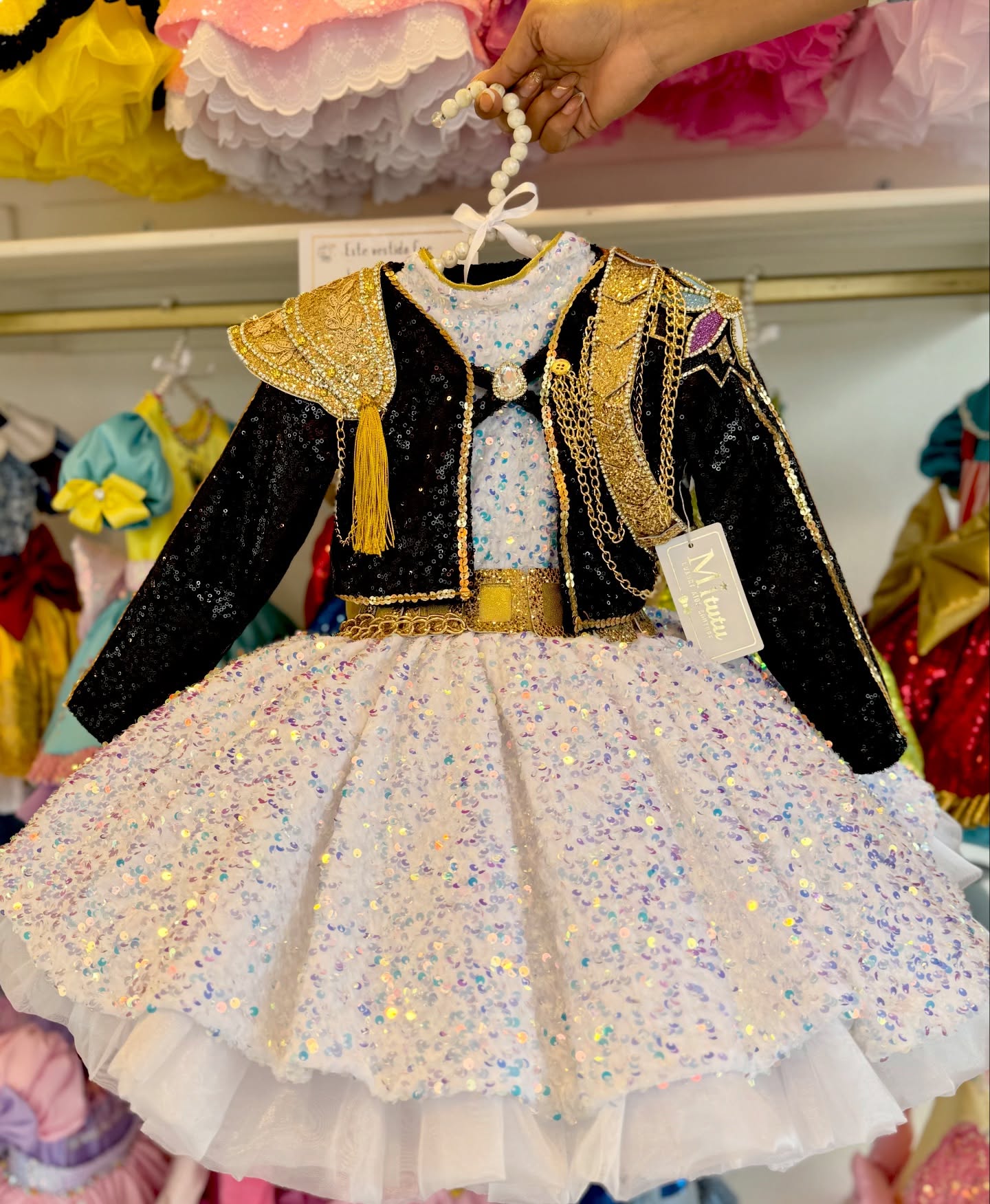 Este modelito combina una espectacular chaquetita negra con aplicaciones doradas, hombreras brillantes y delicadas cadenas decorativas que le dan un toque poderoso. 💫