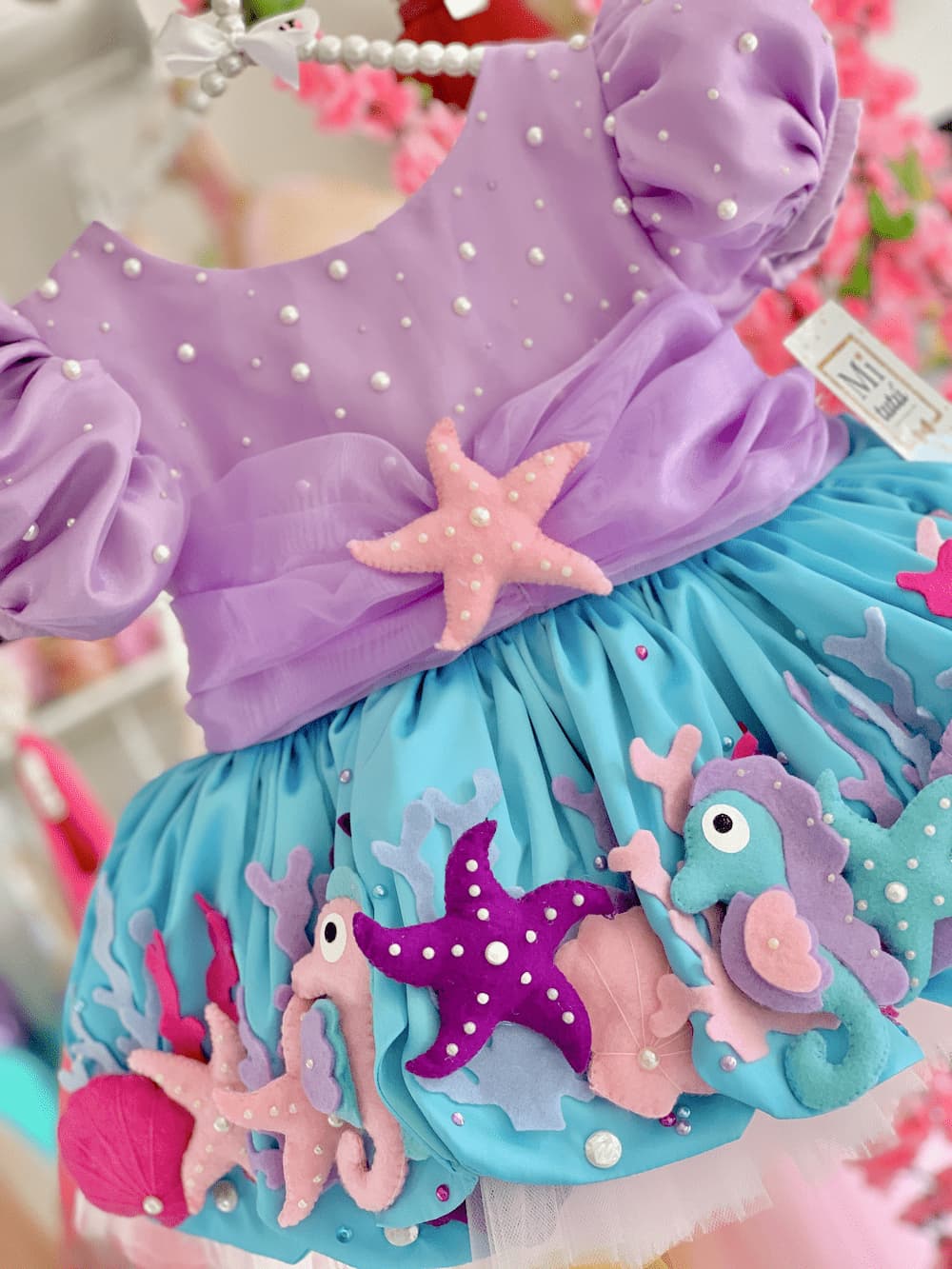 Hermoso vestido Mar 3D. Este deslumbrante vestidito, meticulosamente confeccionado a mano, cautiva con personajes confeccionados a mano que rinden homenaje a las maravillas del mar, modelito corto y muy esponjadito.