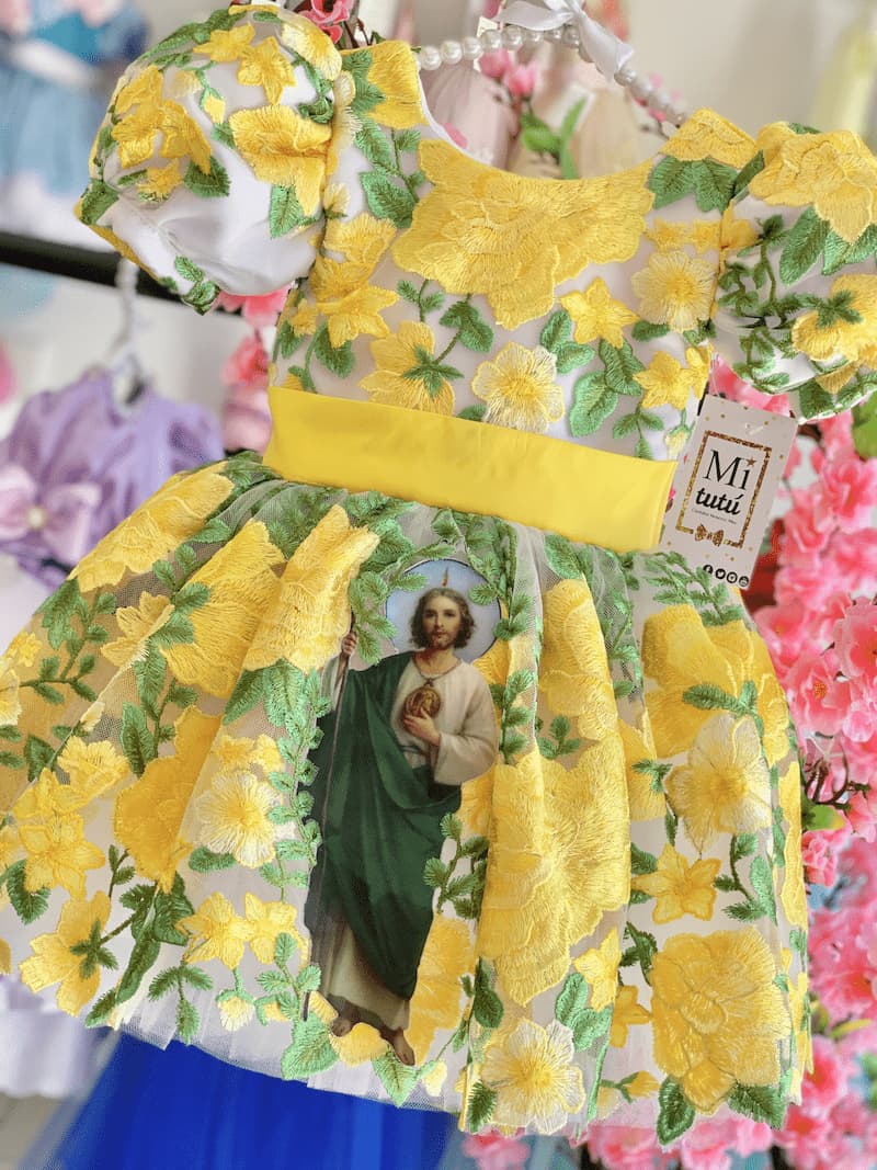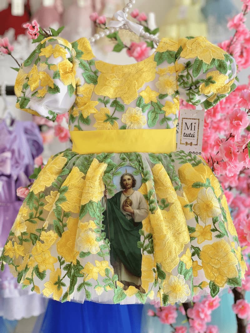 Este hermoso vestido inspirado en San Judas Tadeo muestra la gracia y la devoción con un toque de dulzura. Con un diseño corto a la rodilla, este modelo esponjado resalta la inocencia y la alegría de tu pequeña. Detalles cuidadosamente elaborados rinden homenaje a la espiritualidad, mientras que la suavidad y elegancia del vestido aseguran que sea una elección encantadora para cualquier celebración. Un atuendo celestial para que tu niña brille con luz propia en su día especial.