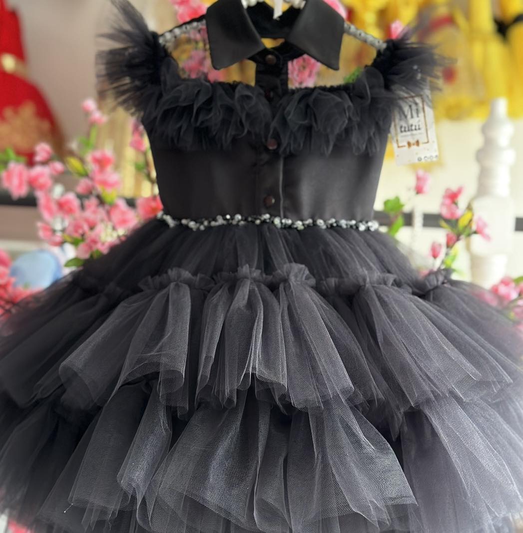 Encantador vestido inspirado en look baile de Merlina. Su modelo corto a la rodilla y muy esponjadito le confiere un toque de frescura y diversión, ¡Presenciar a tu niña luciendo este vestido es presenciar la alegría hecha moda!. Un look muy Addams,