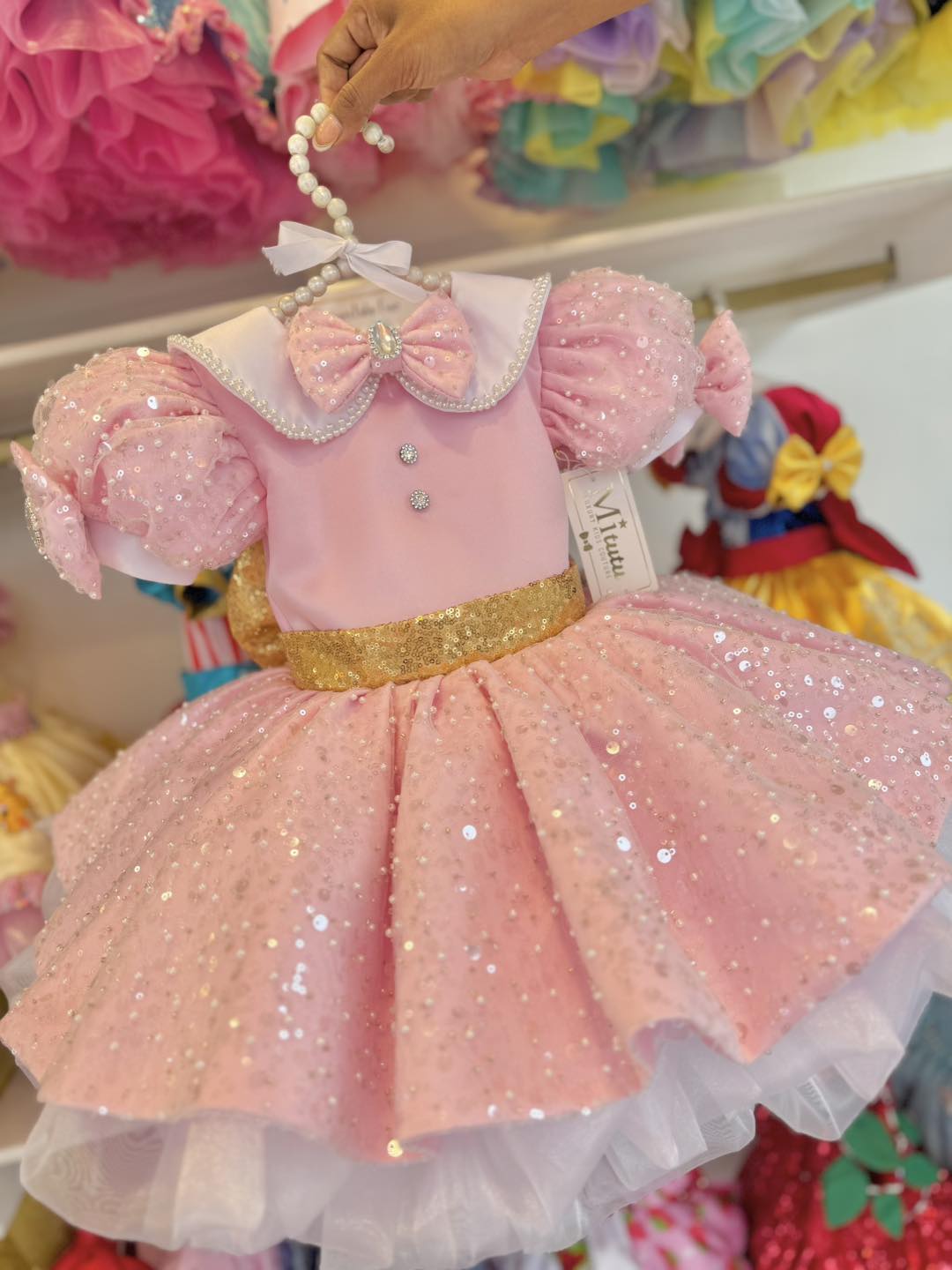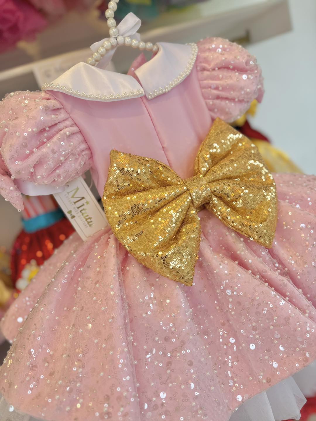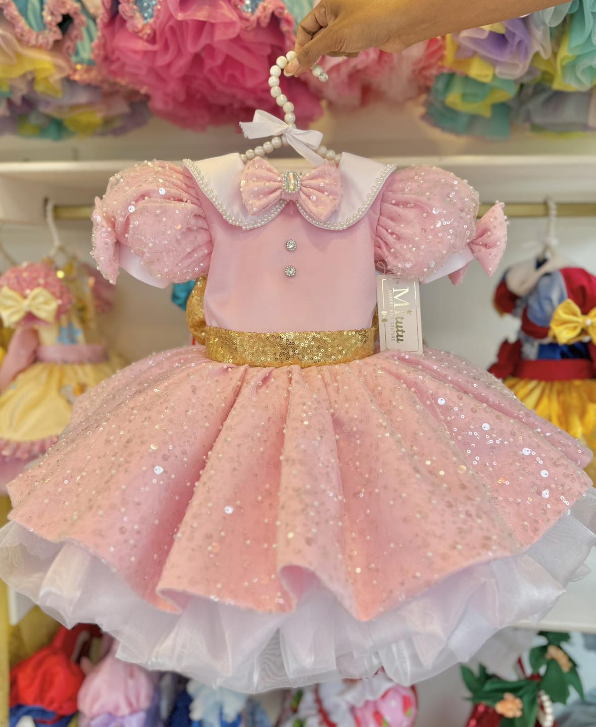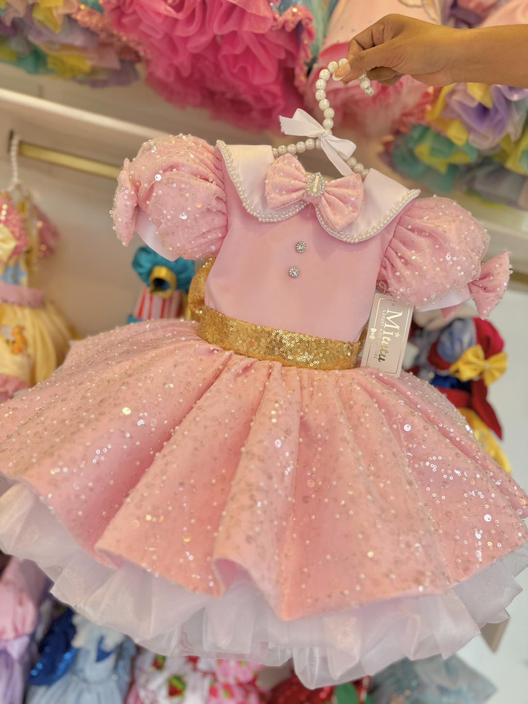 Encantador vestido infantil inspirado en Minnie, diseñado para hacer brillar a tu pequeña en sus momentos más especiales. Confeccionado en un delicado tono rosa, este modelo destaca por su falda corta a la rodilla, súper esponjadita, que aporta volumen, movimiento y un look verdaderamente mágico.