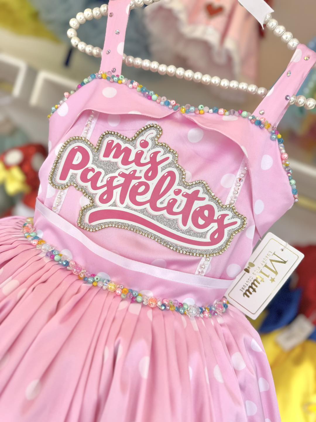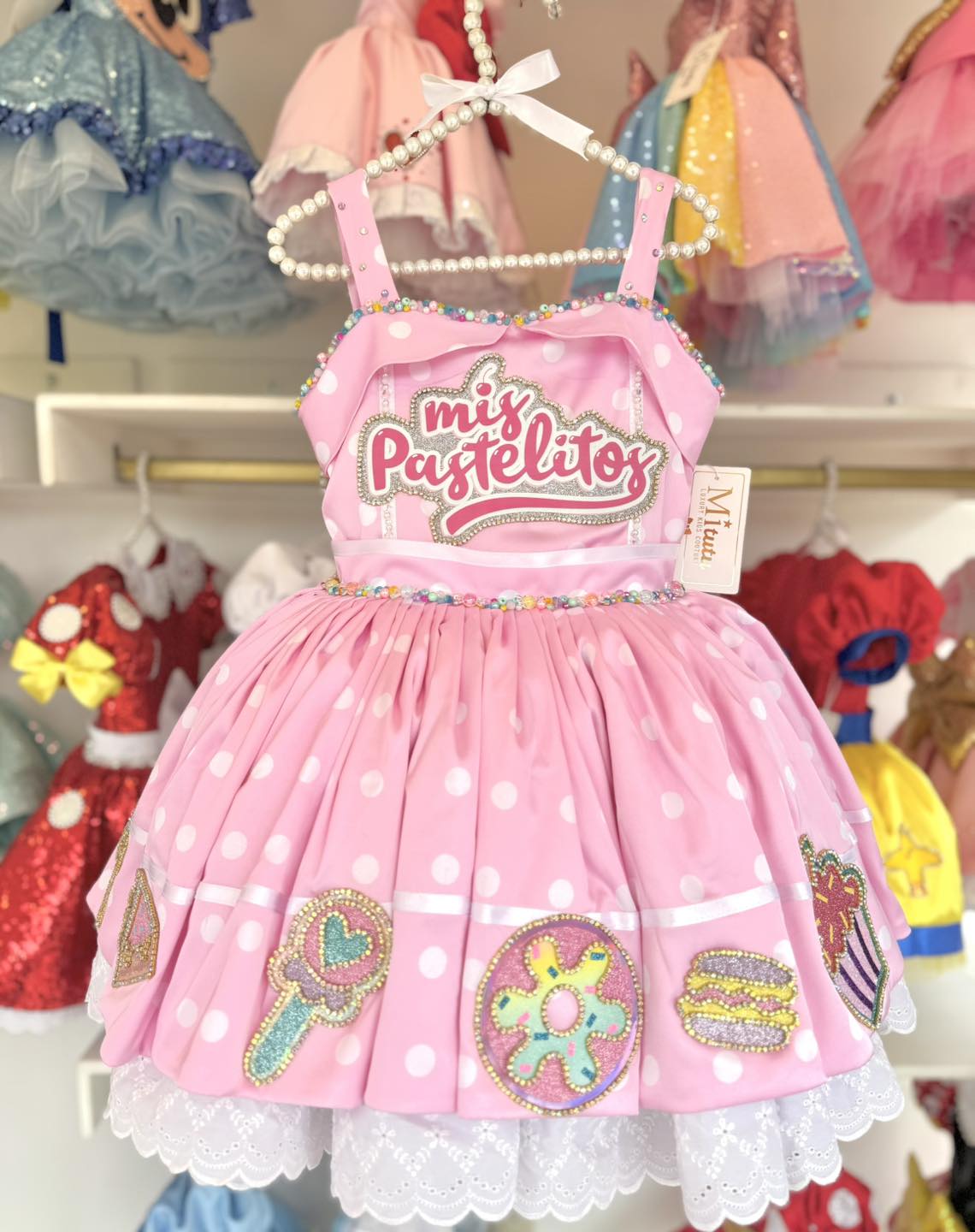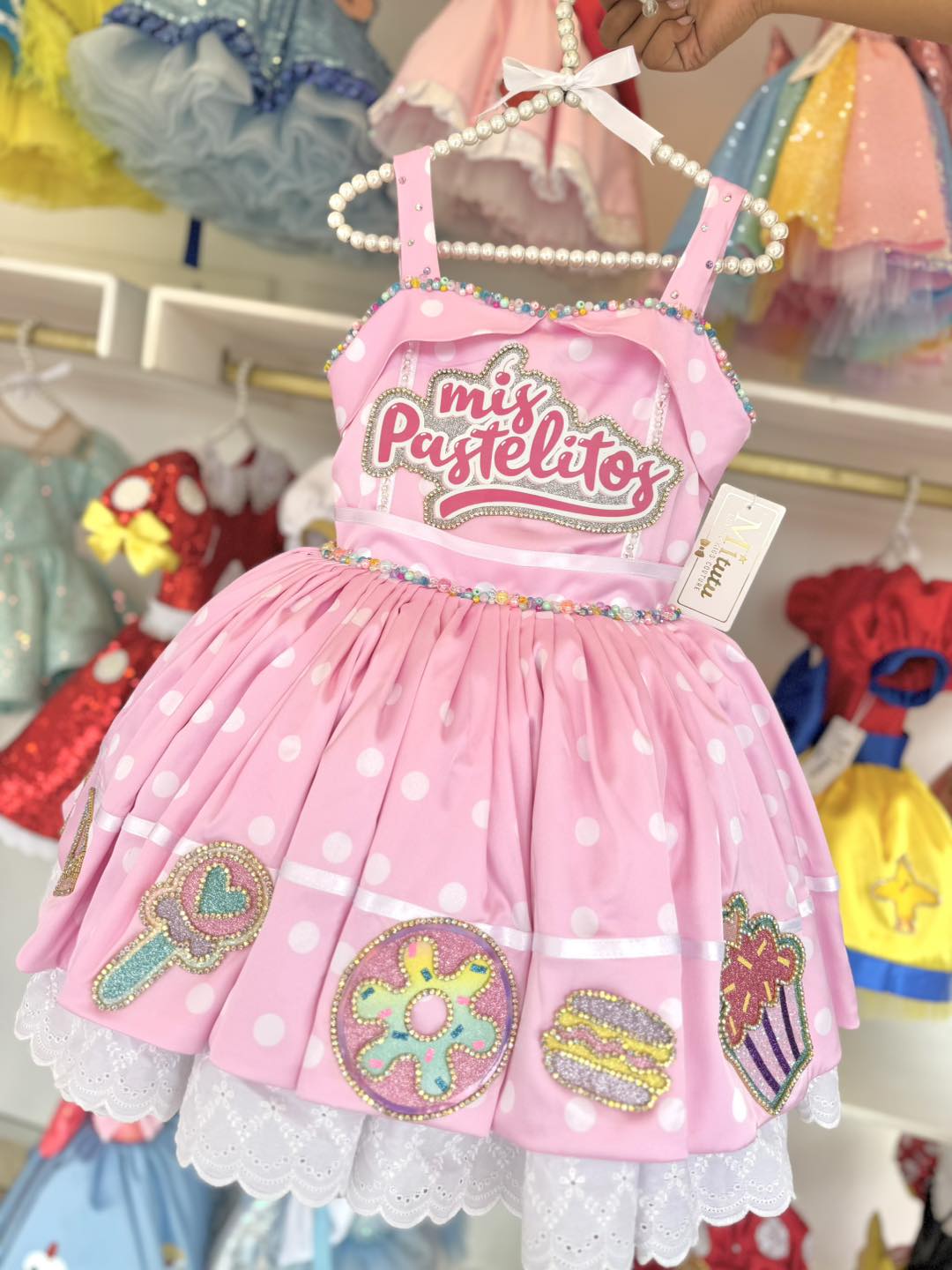 ¡Encantador! Este vestido te transportará al mundo de Mis Pastelitos. Perfecto para celebrar cumpleaños y capturar momentos especiales. ¡Haz tu pedido ahora y lleva dulzura a donde quiera que vayas! 🍰✨¡Dale un toque dulce a tu look con nuestro hermoso vestido inspirado en Mis Pastelitos! 🎂Este modelo corto y esponjadito te hará lucir encantadora. ¡Envíos disponibles a todo México y el extranjero! 🌍💕