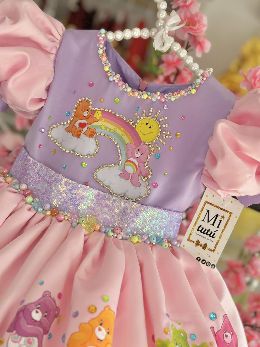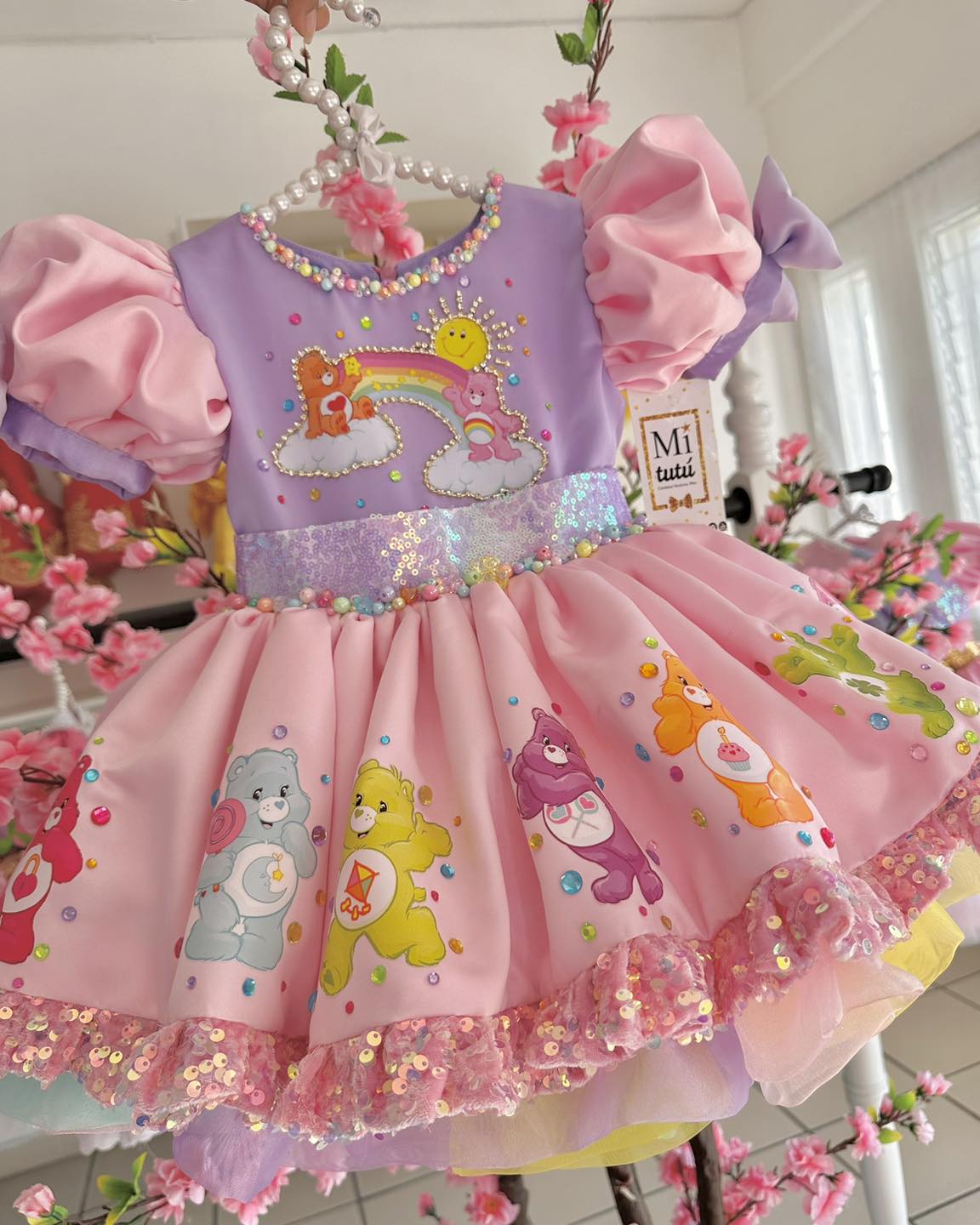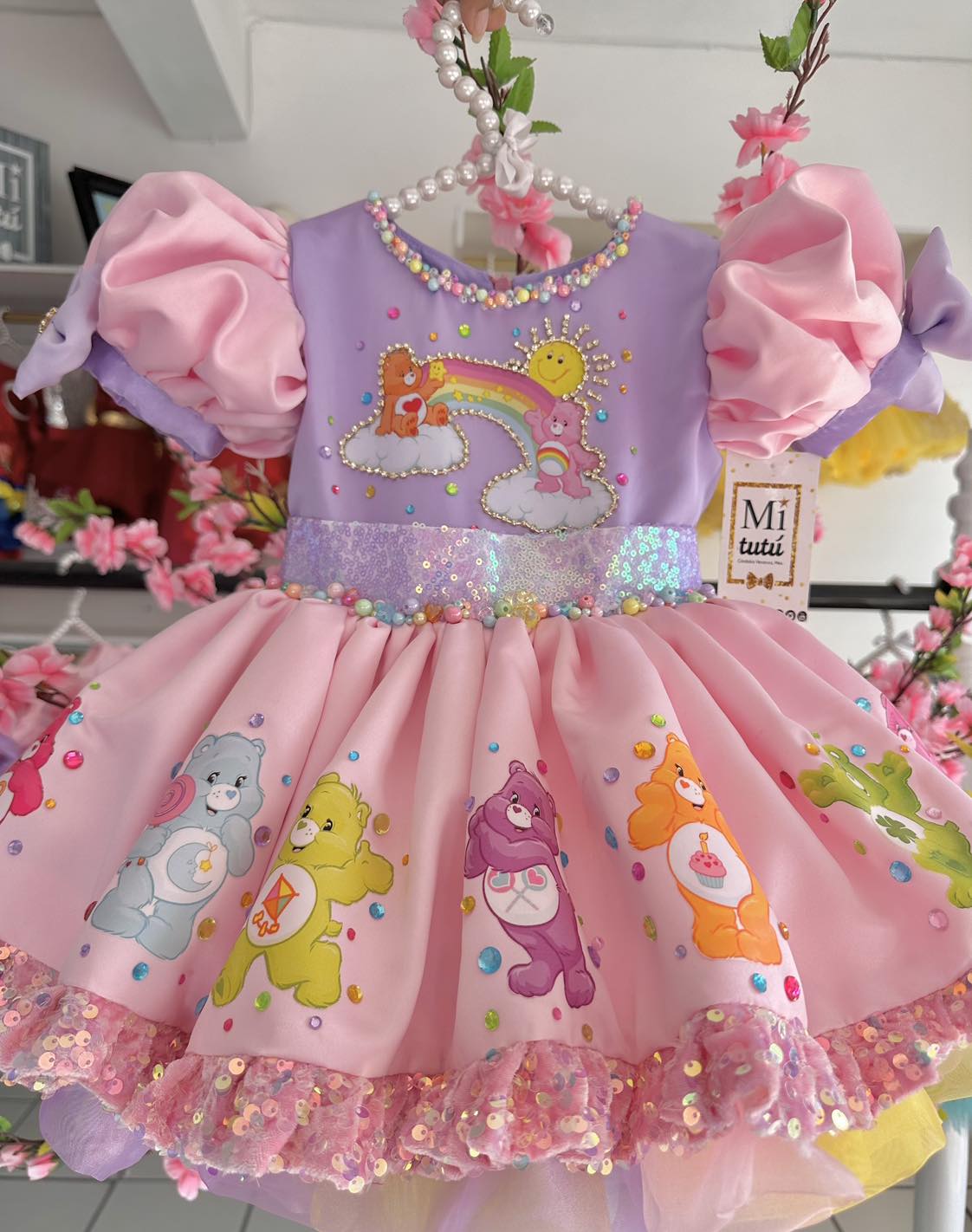 Encantador vestido inspirado en los adorables Ositos Cariñositos. Este hermoso vestidito, confeccionado a mano con cuidado artesanal, este es un modelito corto y muy esponjadito. Cada detalle cuenta una historia, con bordados a mano que dan vida a tus personajes favoritos de los Ositos Cariñositos. Los pequeños detalles resaltan la destreza y el amor invertido en cada puntada, creando una prenda única y llena de cariño.