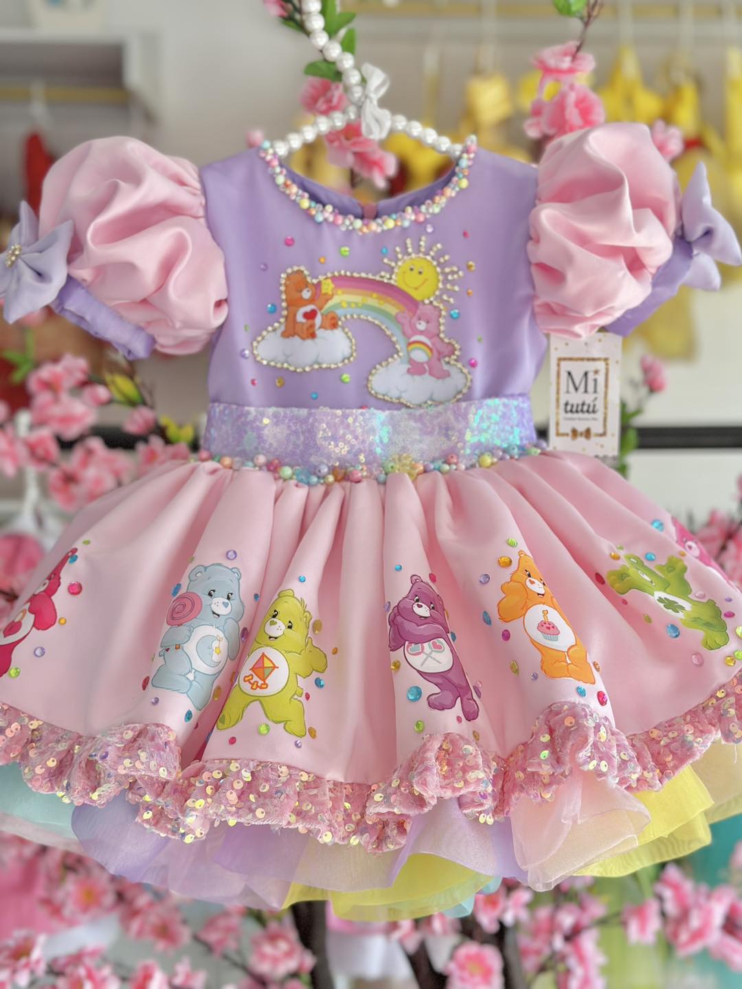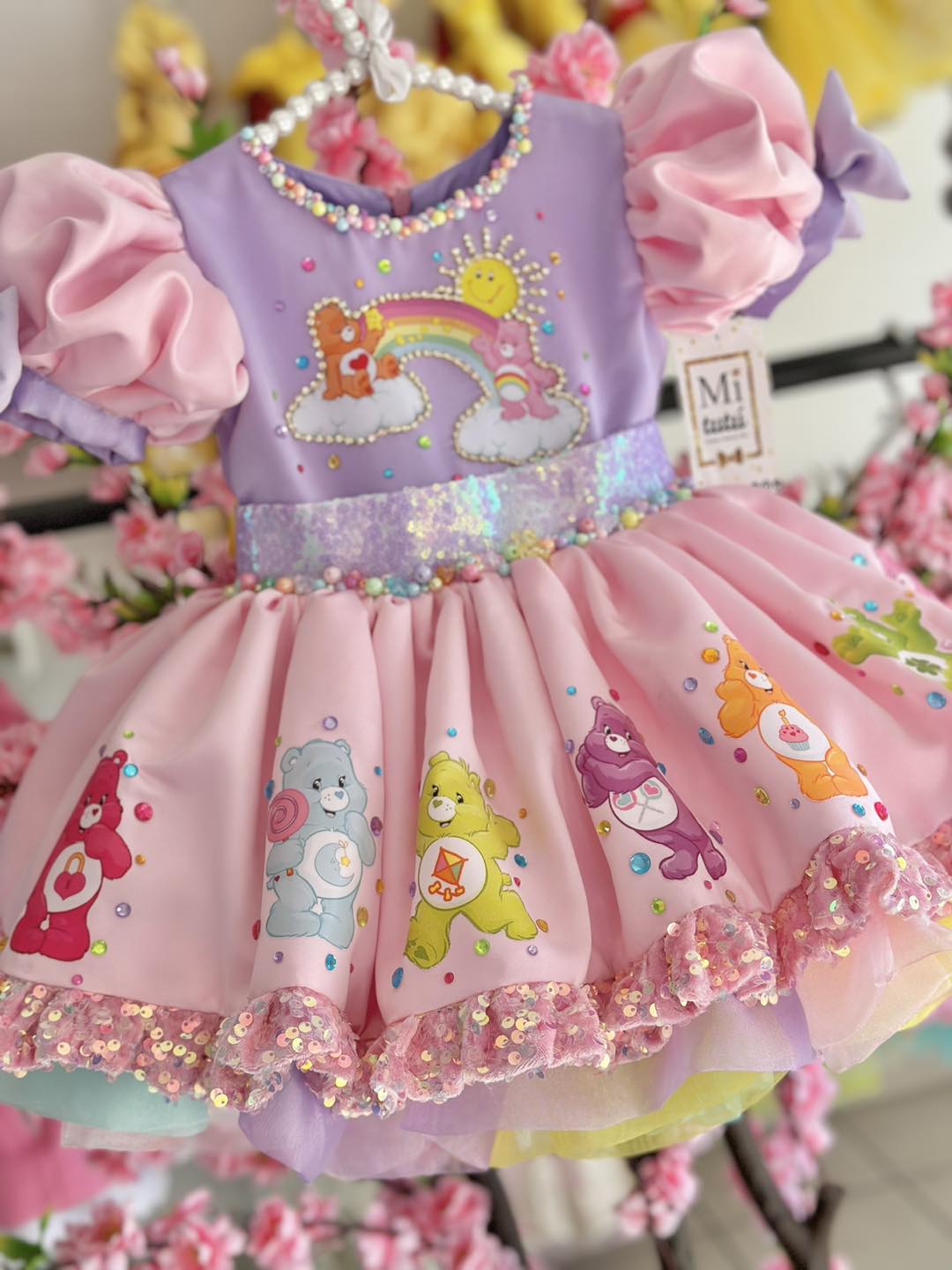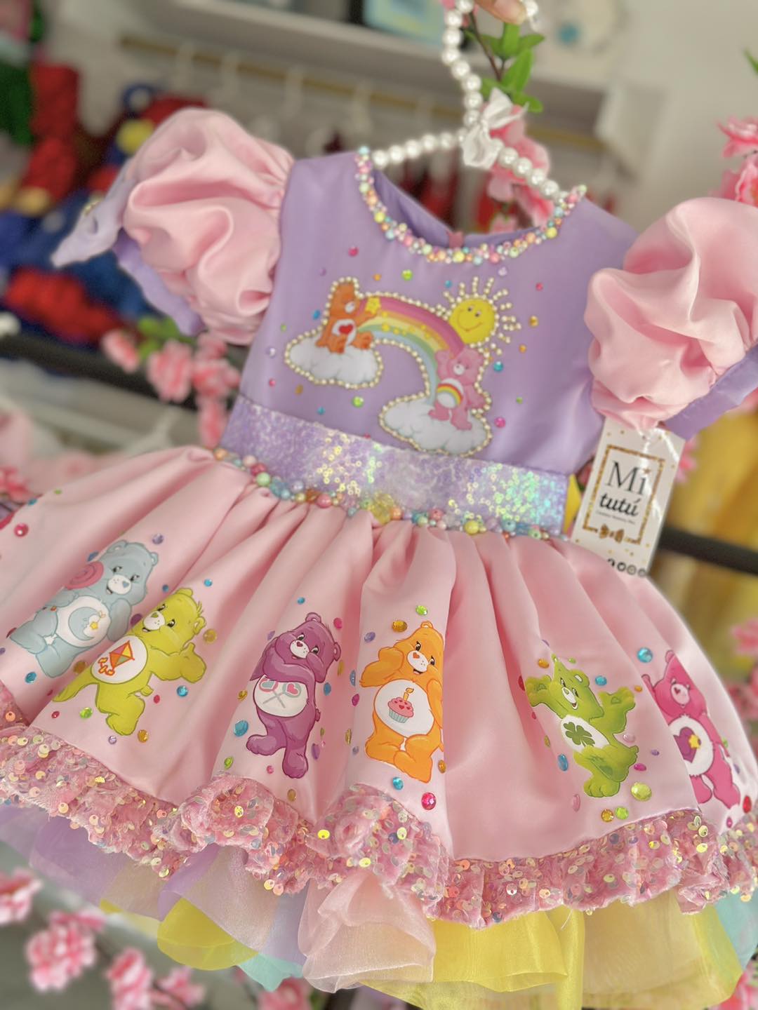 Encantador vestido inspirado en los adorables Ositos Cariñositos. Este hermoso vestidito, confeccionado a mano con cuidado artesanal, este es un modelito corto y muy esponjadito. Cada detalle cuenta una historia, con bordados a mano que dan vida a tus personajes favoritos de los Ositos Cariñositos. Los pequeños detalles resaltan la destreza y el amor invertido en cada puntada, creando una prenda única y llena de cariño.