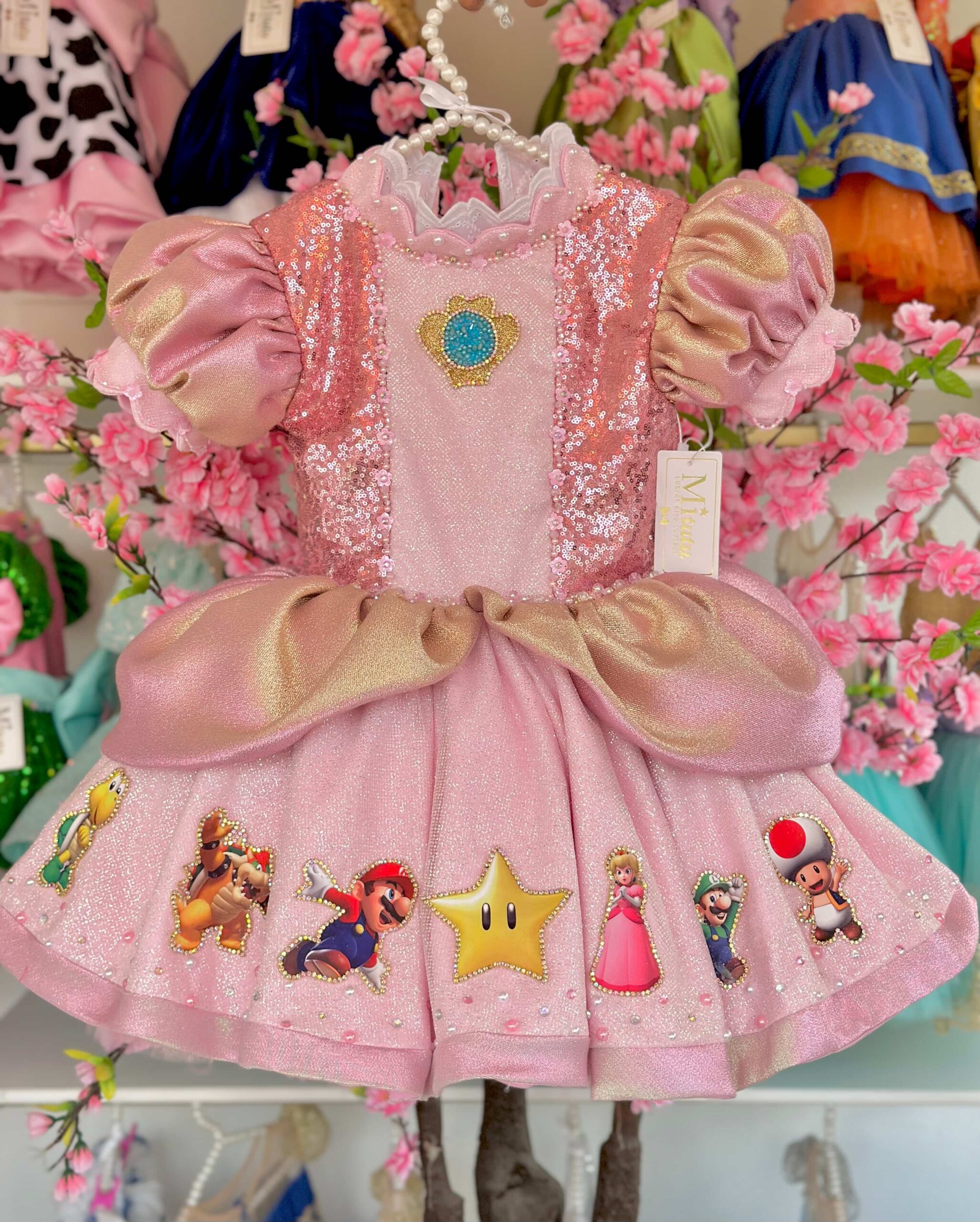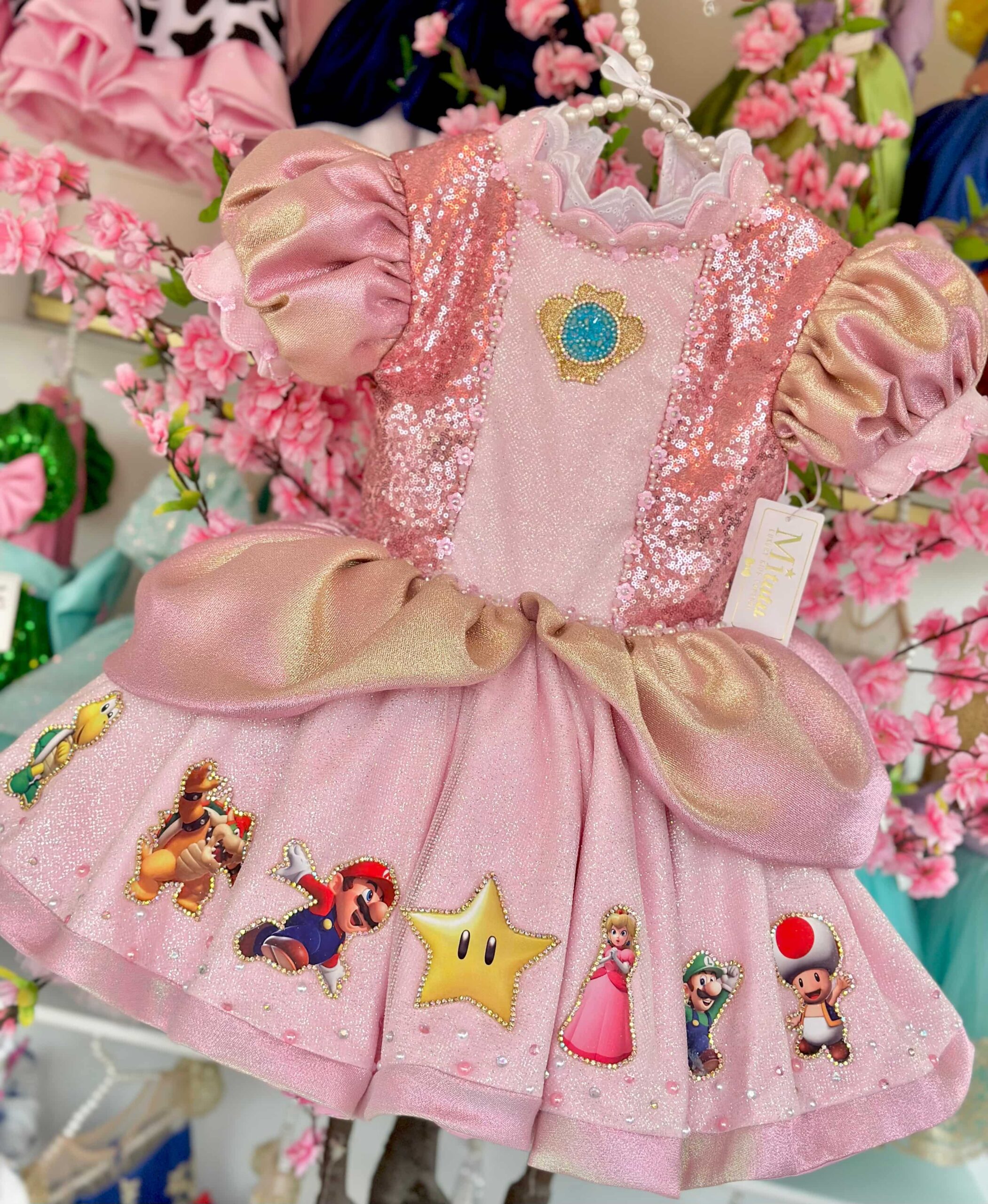 Encantador vestido inspirado en la Princesa Peach de la película de Mario Bros. Cada detalle de este vestidito está adornado con bordados hechos a mano, elevando la calidad y el encanto. Con un modelo corto a la rodilla o modelo largo y una esponjosidad irresistible, este vestido no solo captura la esencia de la princesa favorita, sino que también incorpora a los entrañables personajes de Mario Bros, llevando la magia del reino champiñón a la celebración. Una elección que transformará la ocasión en una fiesta llena de alegría y fantasía.