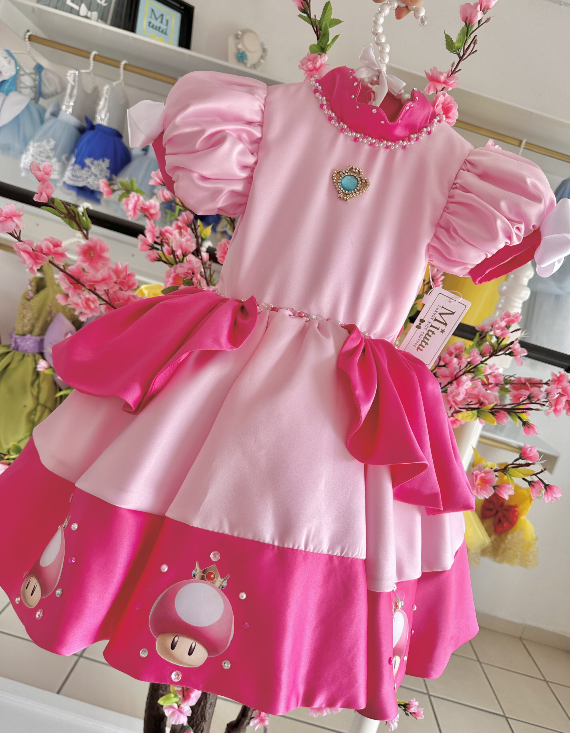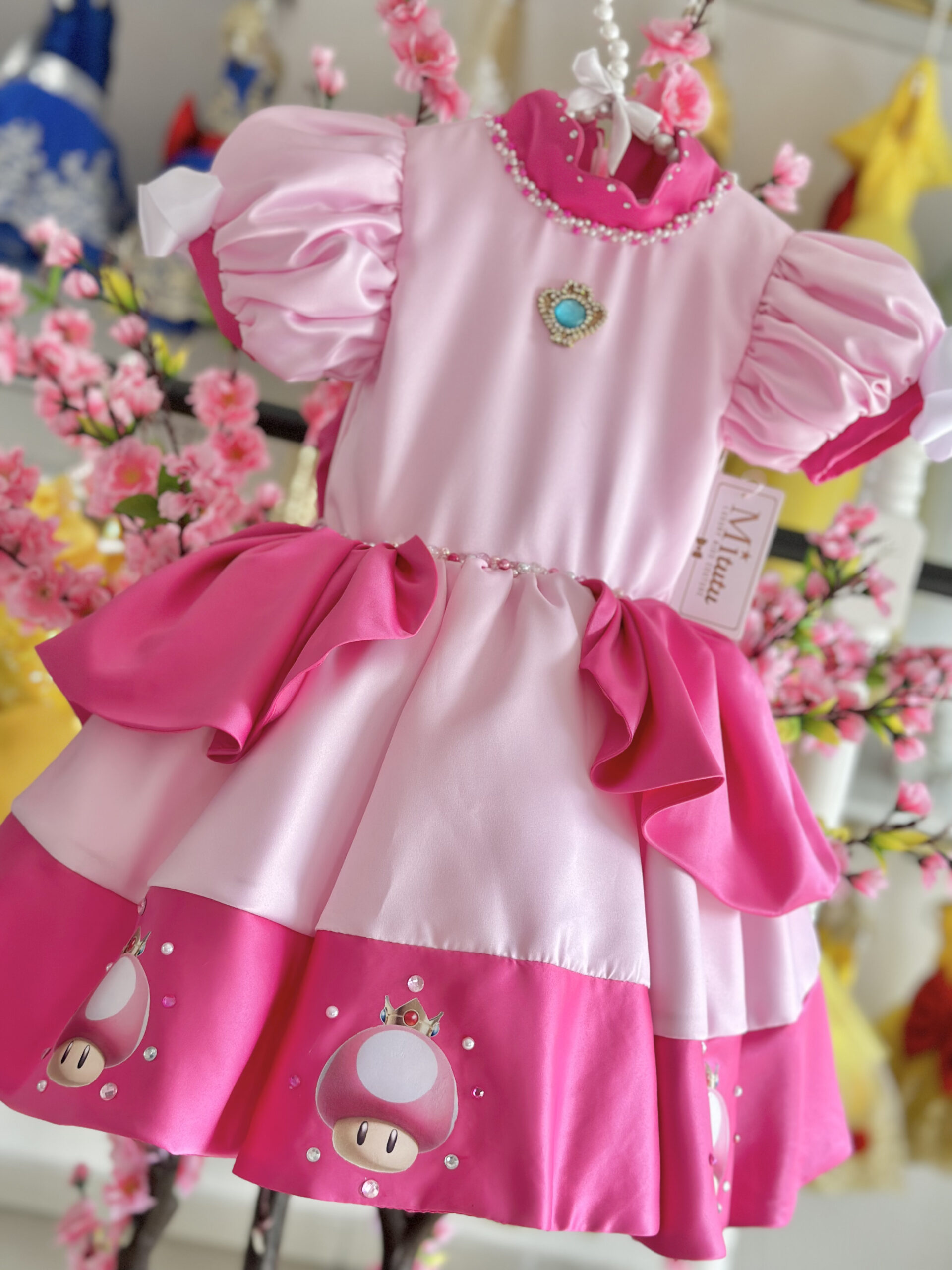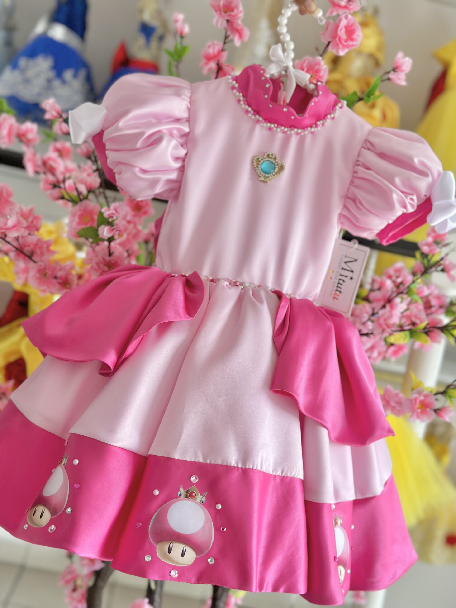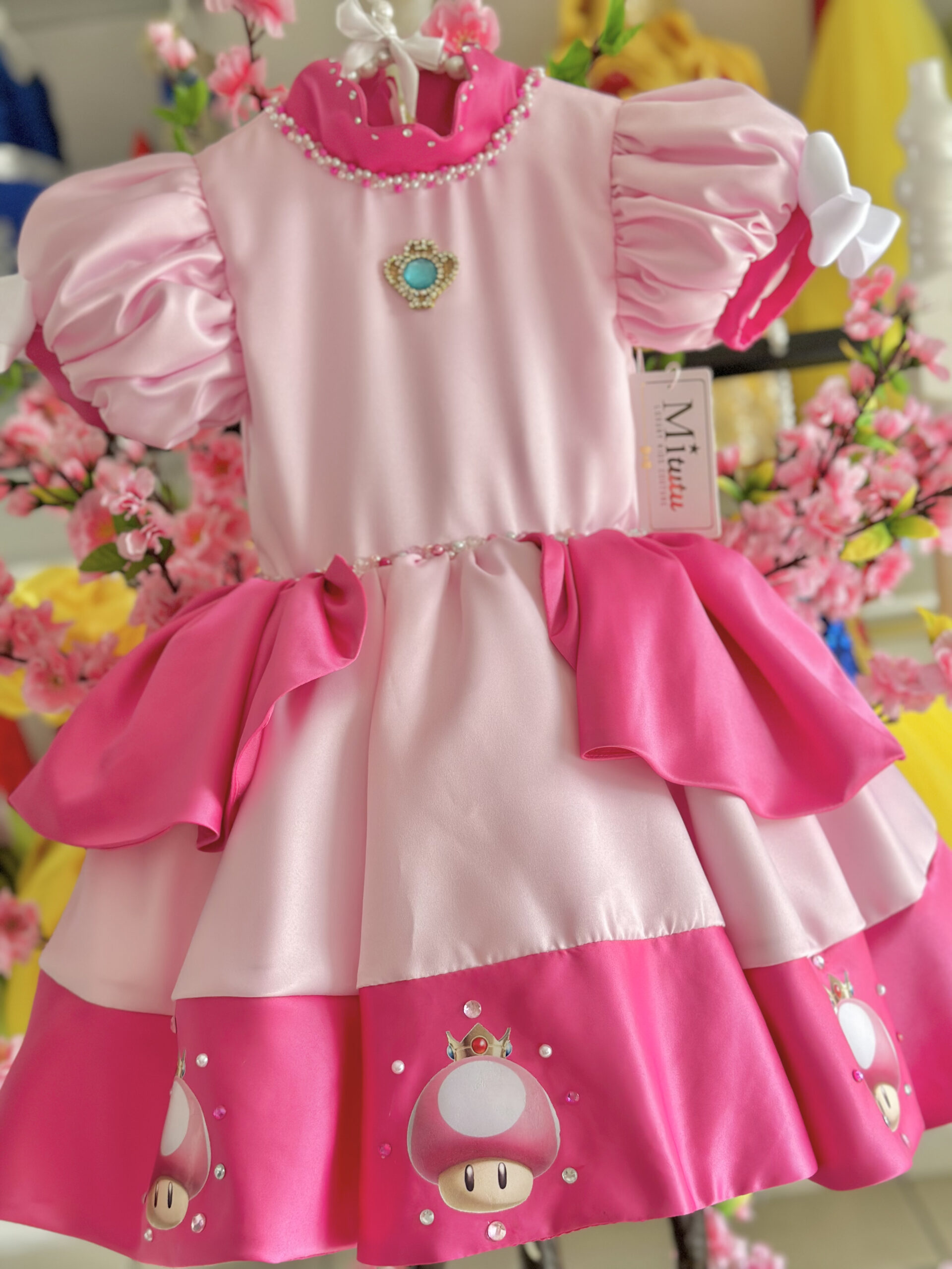 Encantador vestido inspirado en la Princesa Peach de la película de Mario Bros. Cada detalle de este vestidito está adornado con bordados hechos a mano, elevando la calidad y el encanto. Con un modelo corto a la rodilla y una esponjosidad irresistible. Una elección que transformará la ocasión en una fiesta llena de alegría y fantasía.