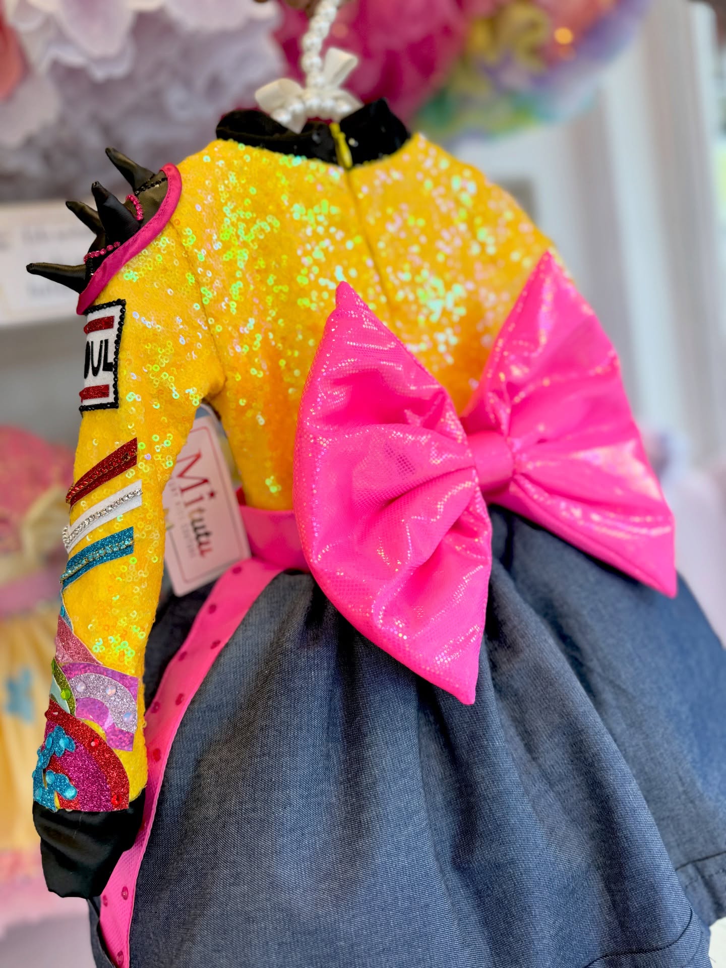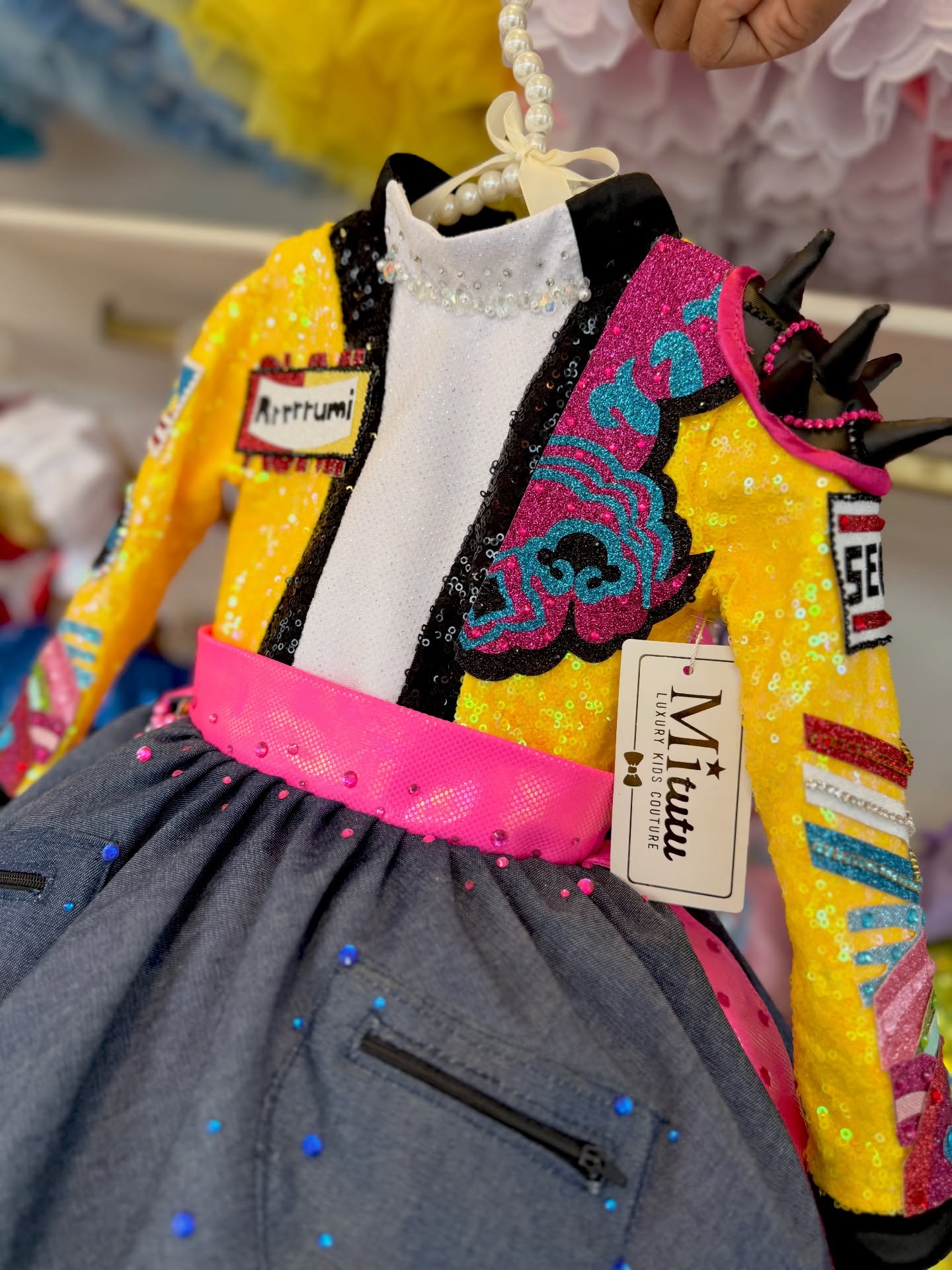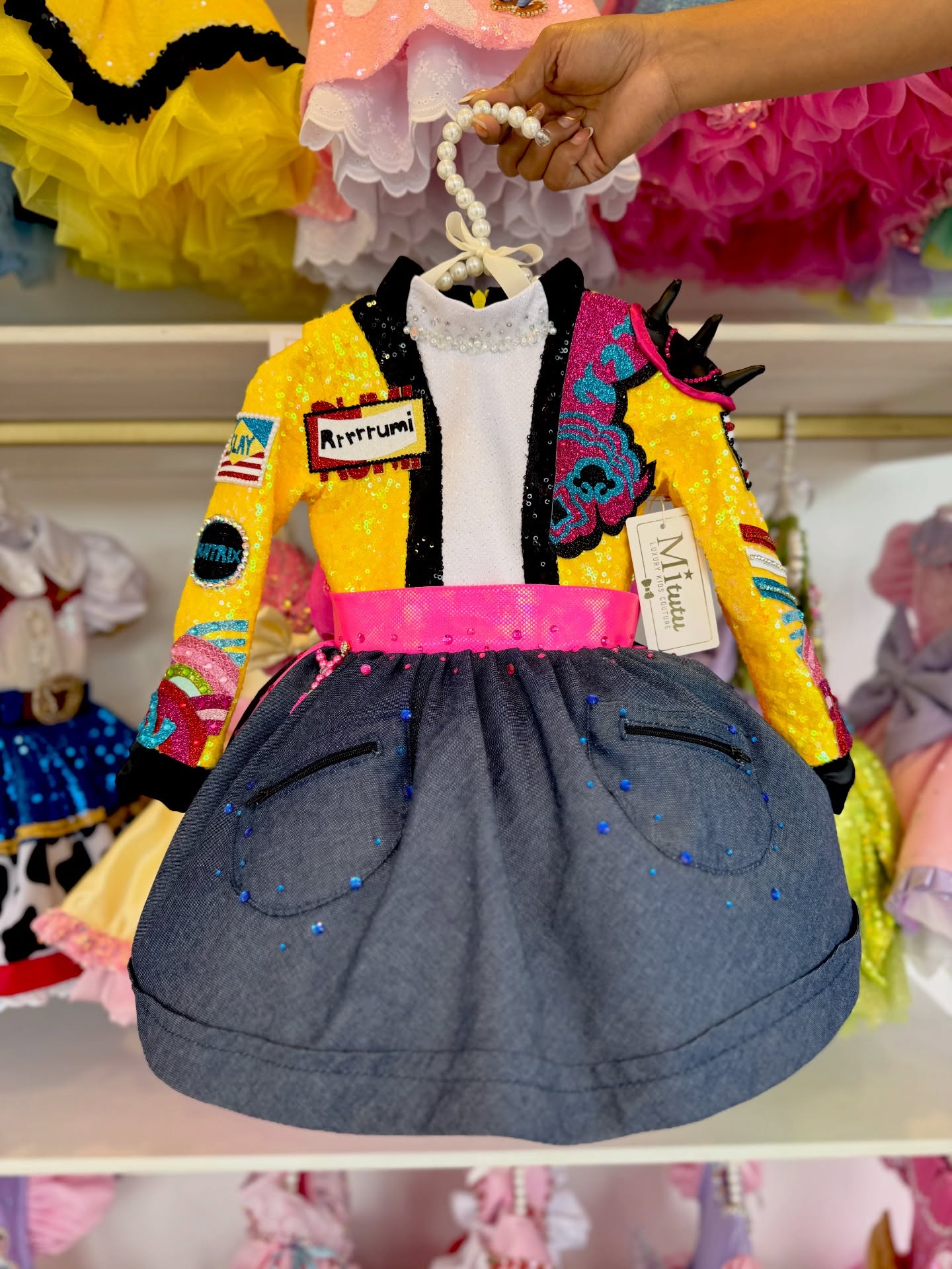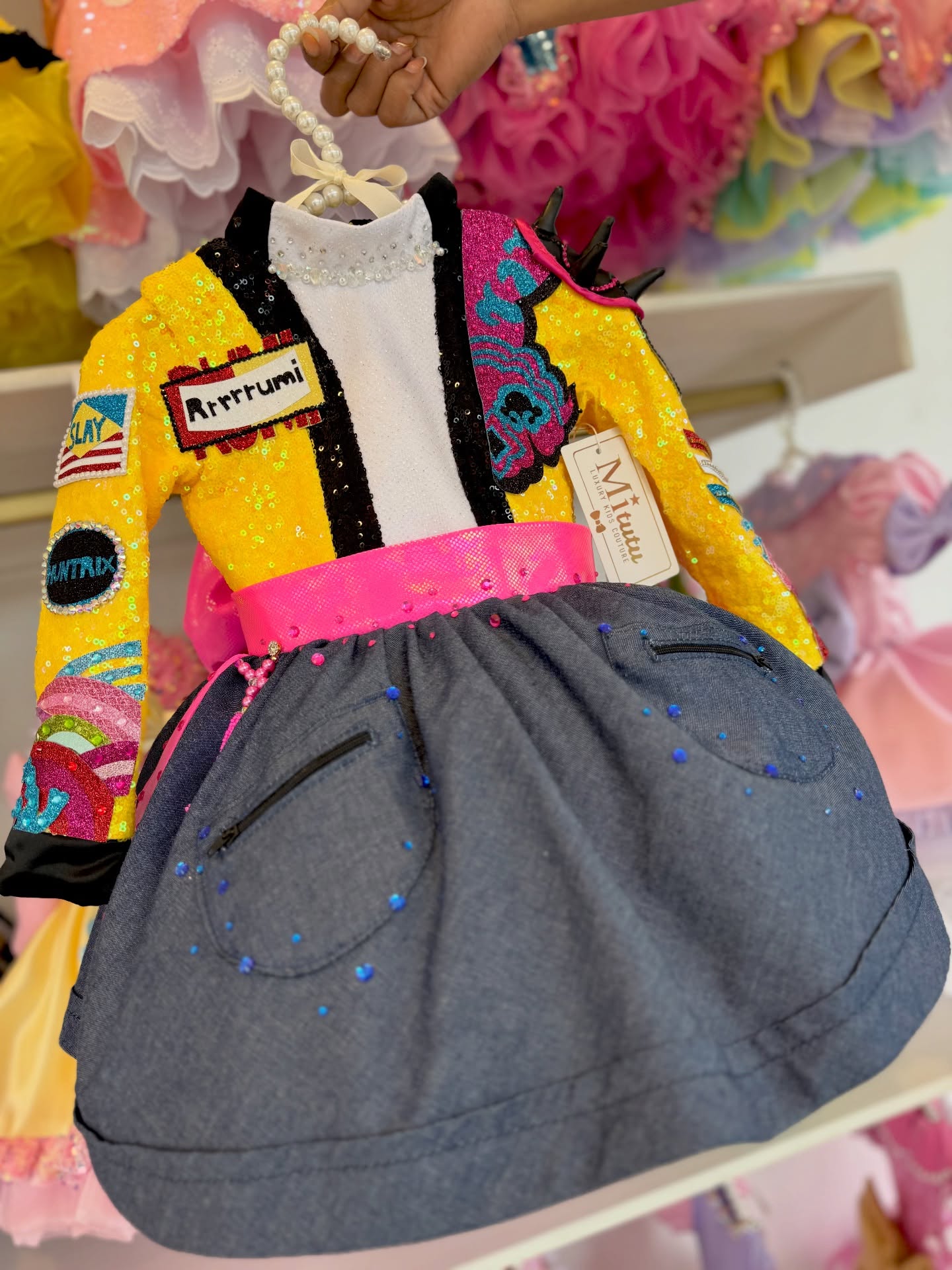 Este modelito combina chaqueta vibrante llena de lentejuelas y parches llamativos, detalles audaces. Corto, esponjadito y con muchísimo carácter, ¡perfecto para pequeñas estrellas!