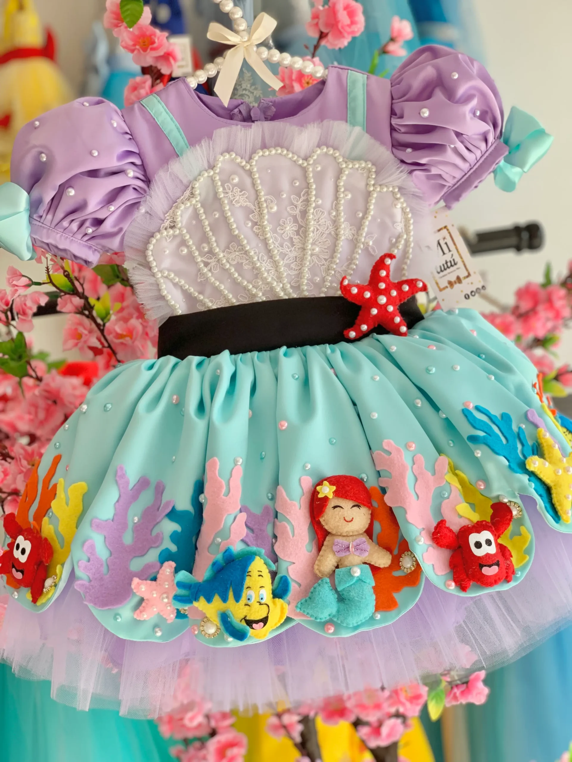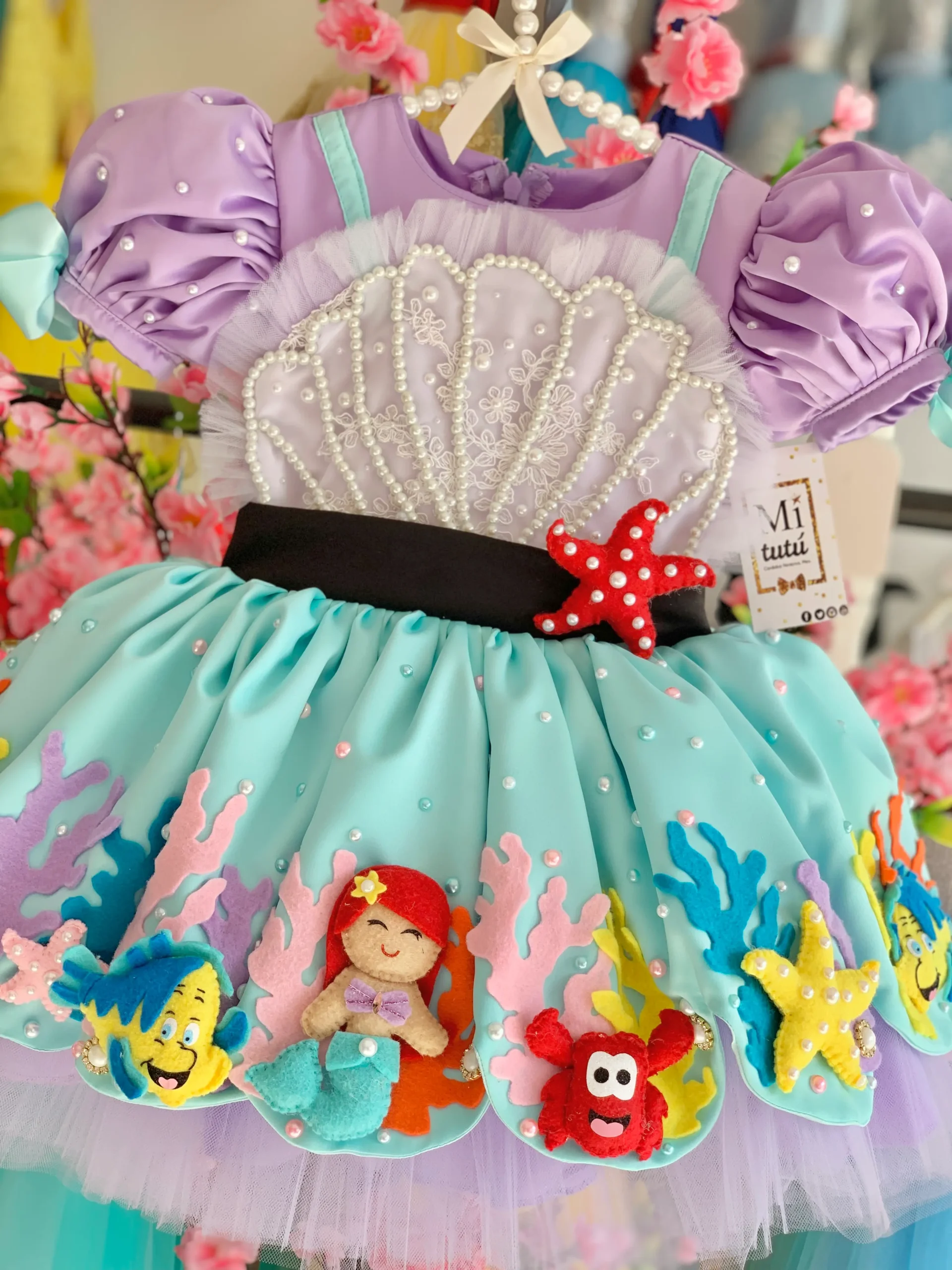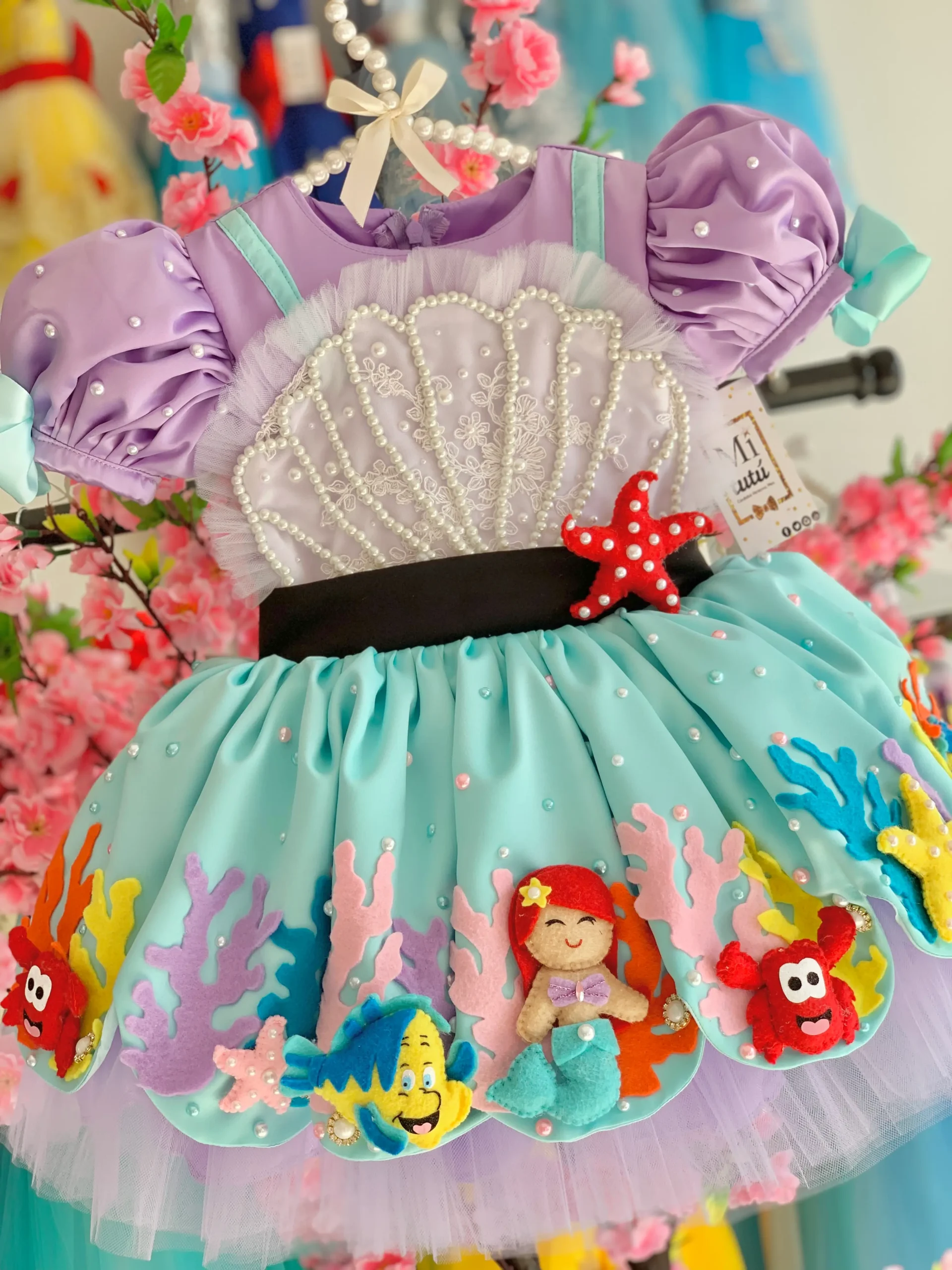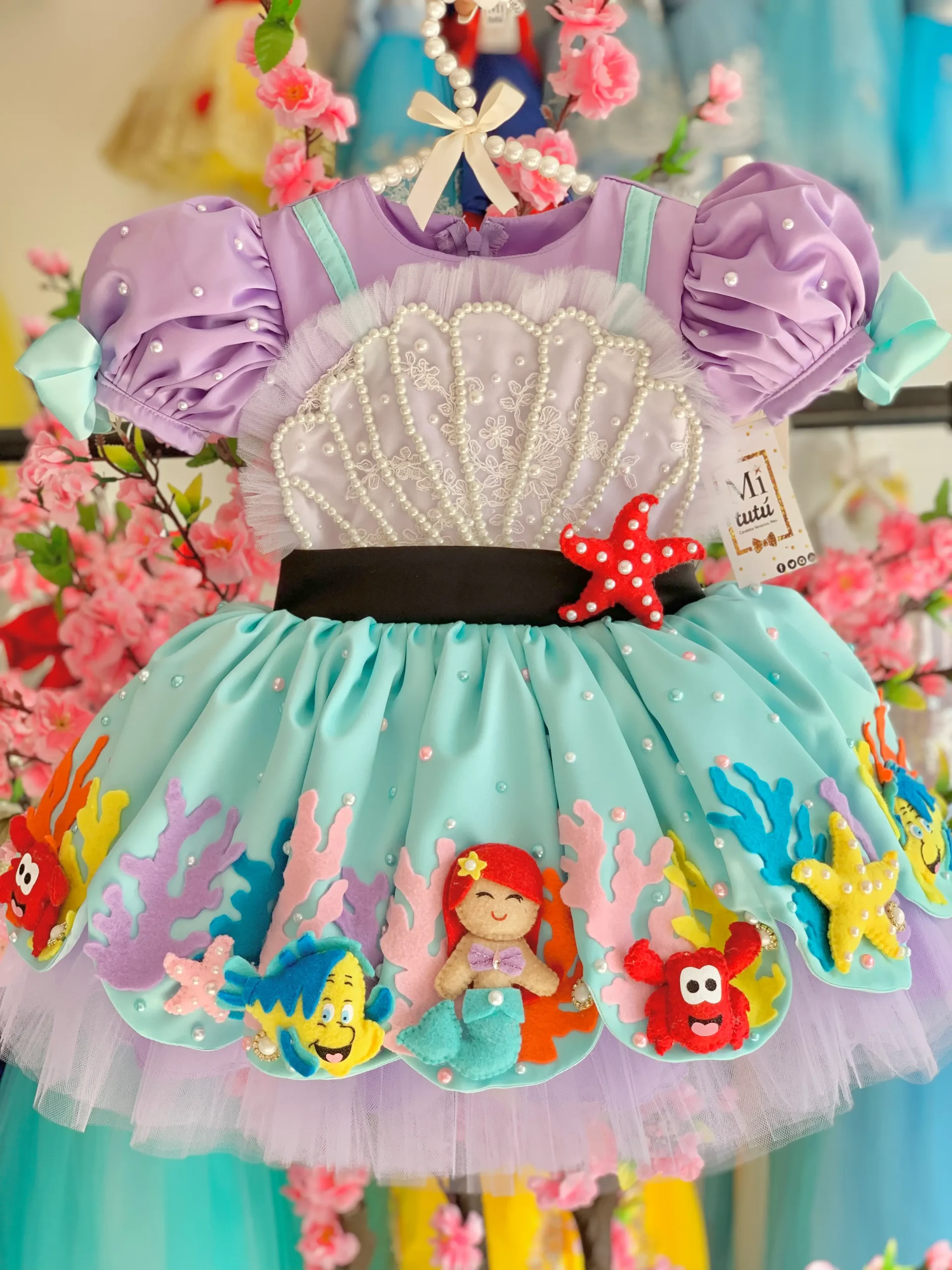 Hermoso vestido sirenita 3D. Este deslumbrante vestidito, meticulosamente confeccionado a mano, cautiva con personajes confeccionados a mano que rinden homenaje a las maravillas del mar, modelito corto y muy esponjadito.