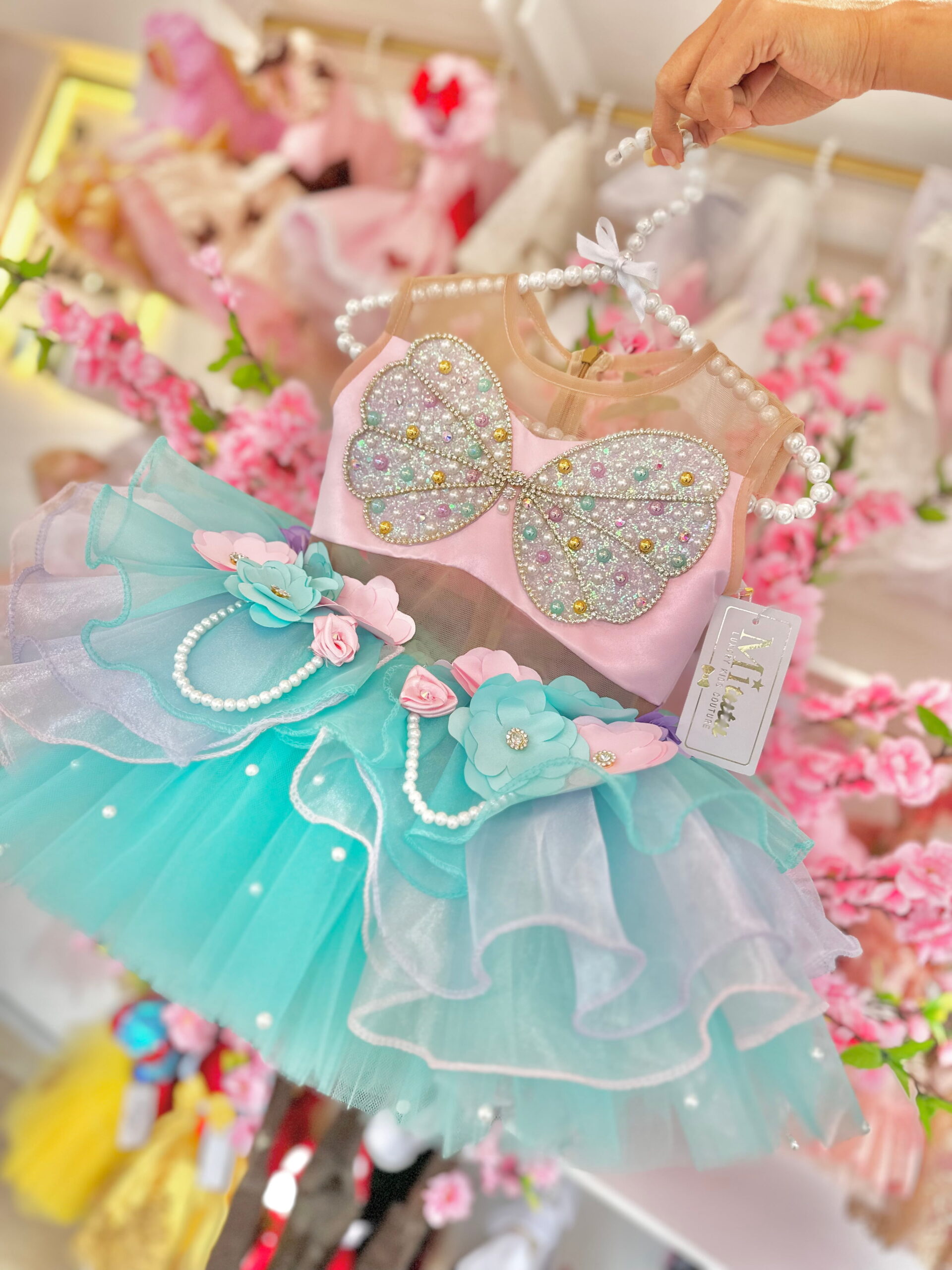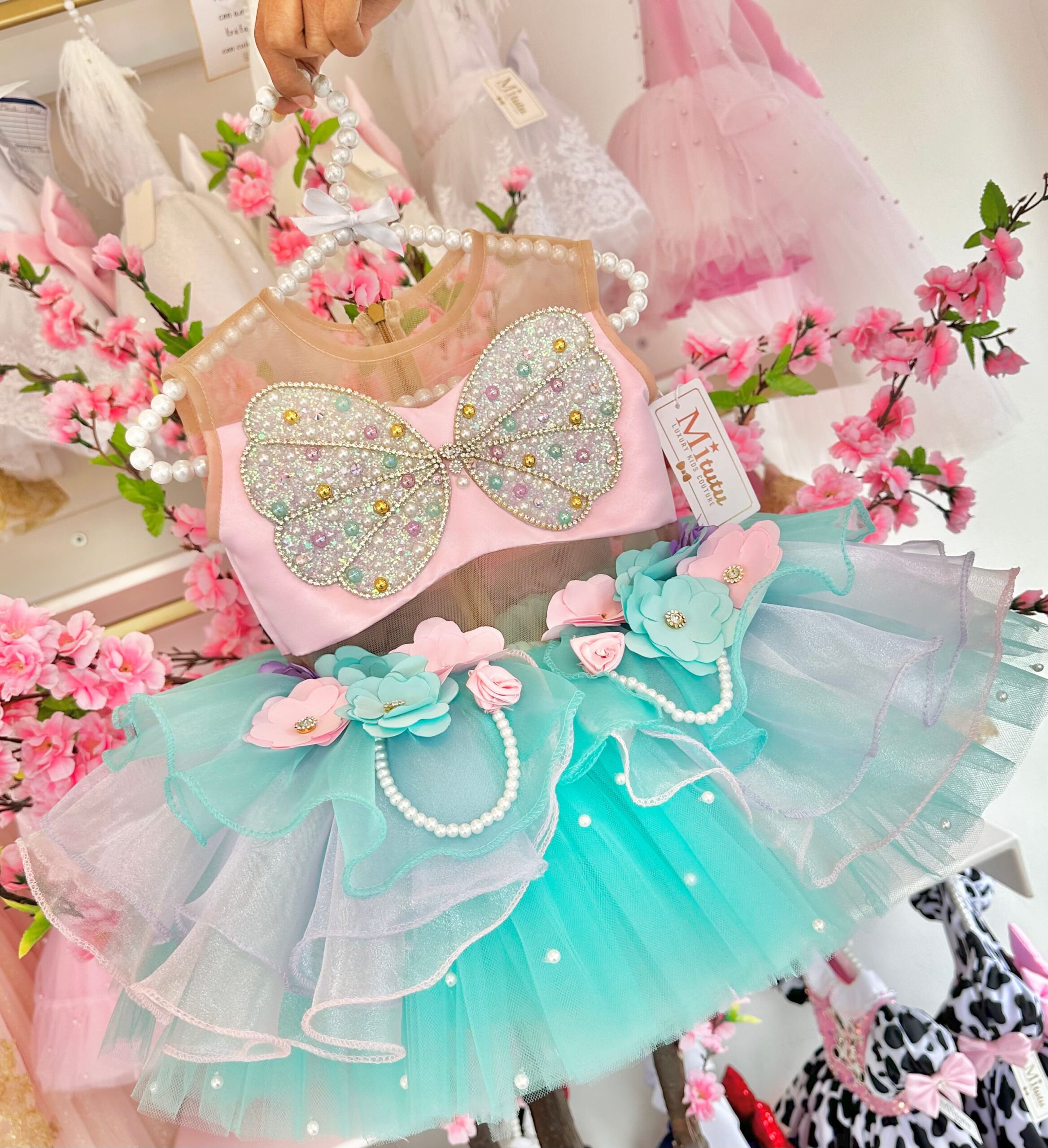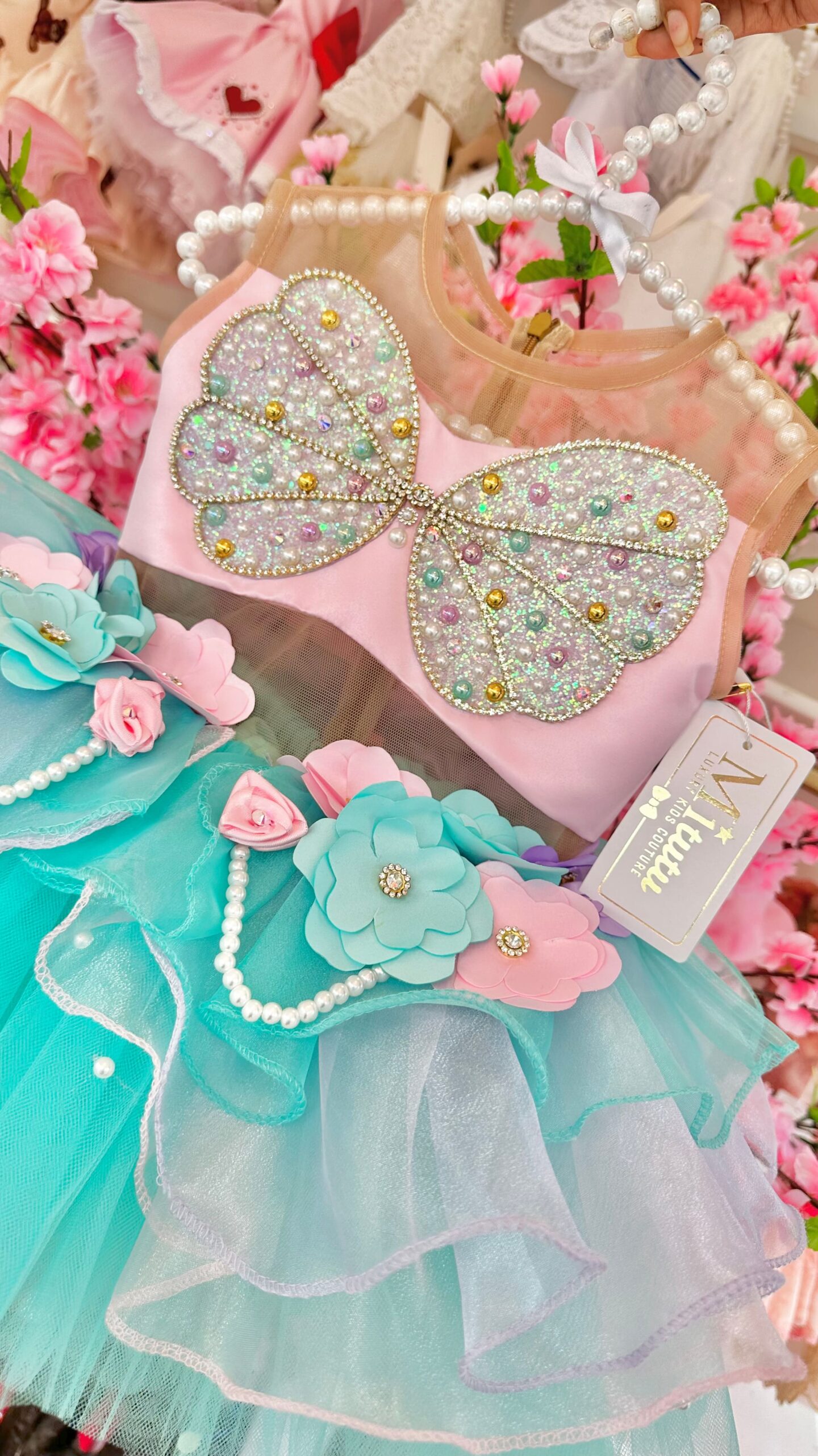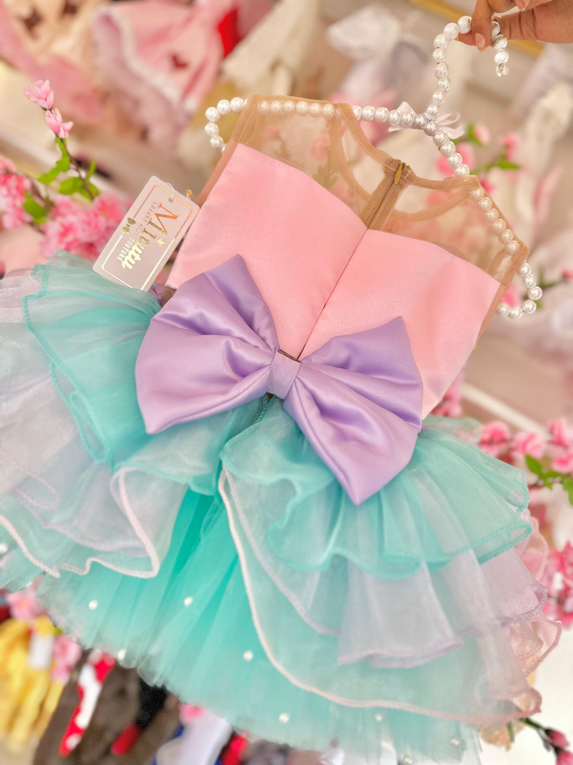 Imagina sumergirte en la magia del océano con nuestro encantador vestido de fiesta infantil, inspirado en la fascinante Sirenita. Este deslumbrante vestidito, meticulosamente confeccionado a mano, cautiva con detalles bordados que rinden homenaje a las maravillas del mar, modelito corto y muy esponjadito.